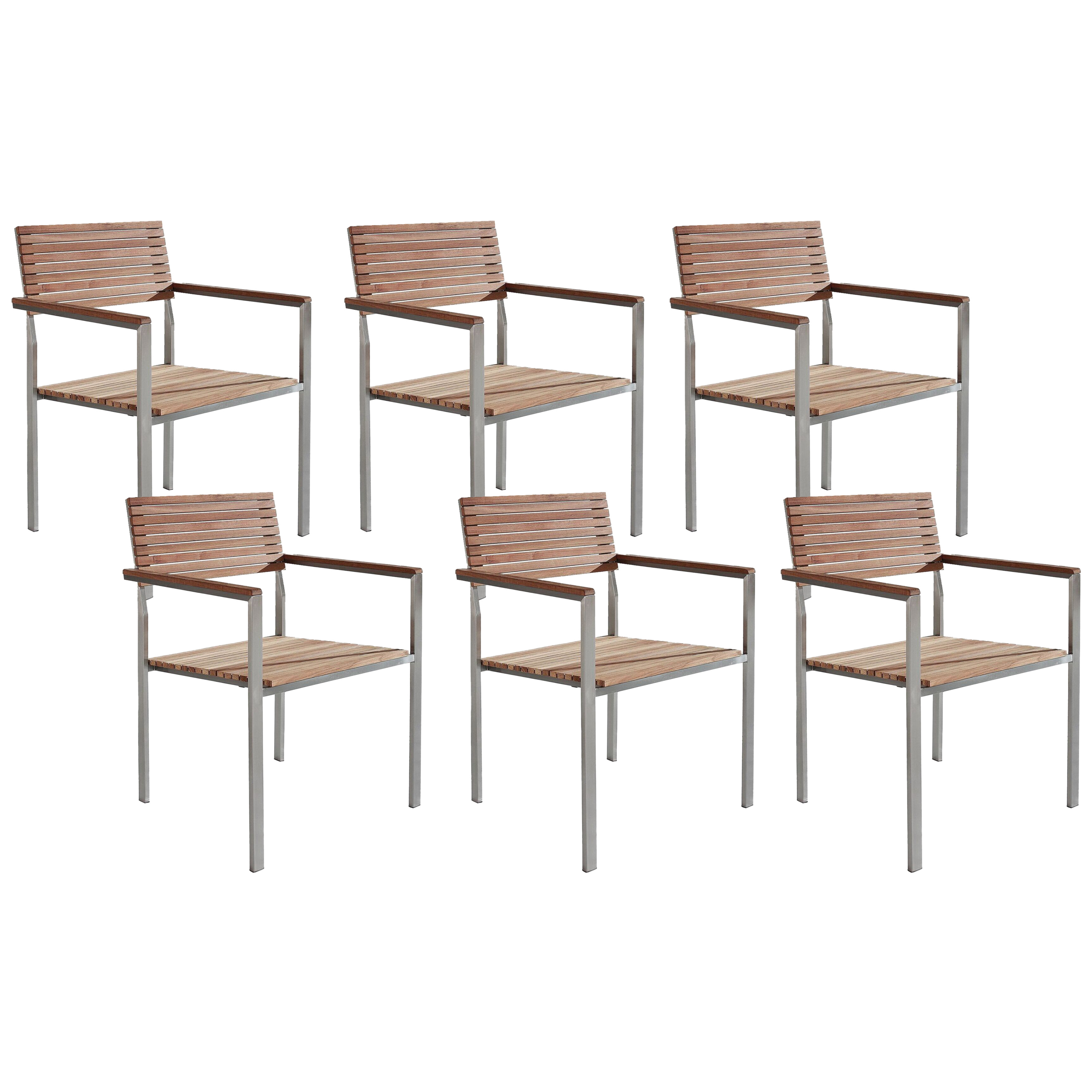 Kaunis puutarhatuoli tiikkipuusta ja teräksestä. Tämä kuuden puutarhatuolin setti auttaa luomaan täydellisen ulkoruokailutilan. Niiden rungot on valmistettu kestävästä harjatusta ruostumattomasta teräksestä. Tuolien selkänojat ja istuinosat sekä käsinojien päälliset on valmistettu öljytystä, lämpimän ruskean sävyisestä tiikistä, joka oikein hoidettuna kestää vuosien käytön. Pinottavan ominaisuutensa ansiosta tuoleja on helppo säilyttää käyttökauden ulkopuolella tai kun ne eivät ole käytössä. Materiaaliensa ja sävyjensä ansiosta puutarhatuolit huokuvat modernin minimaalista tyyliä.