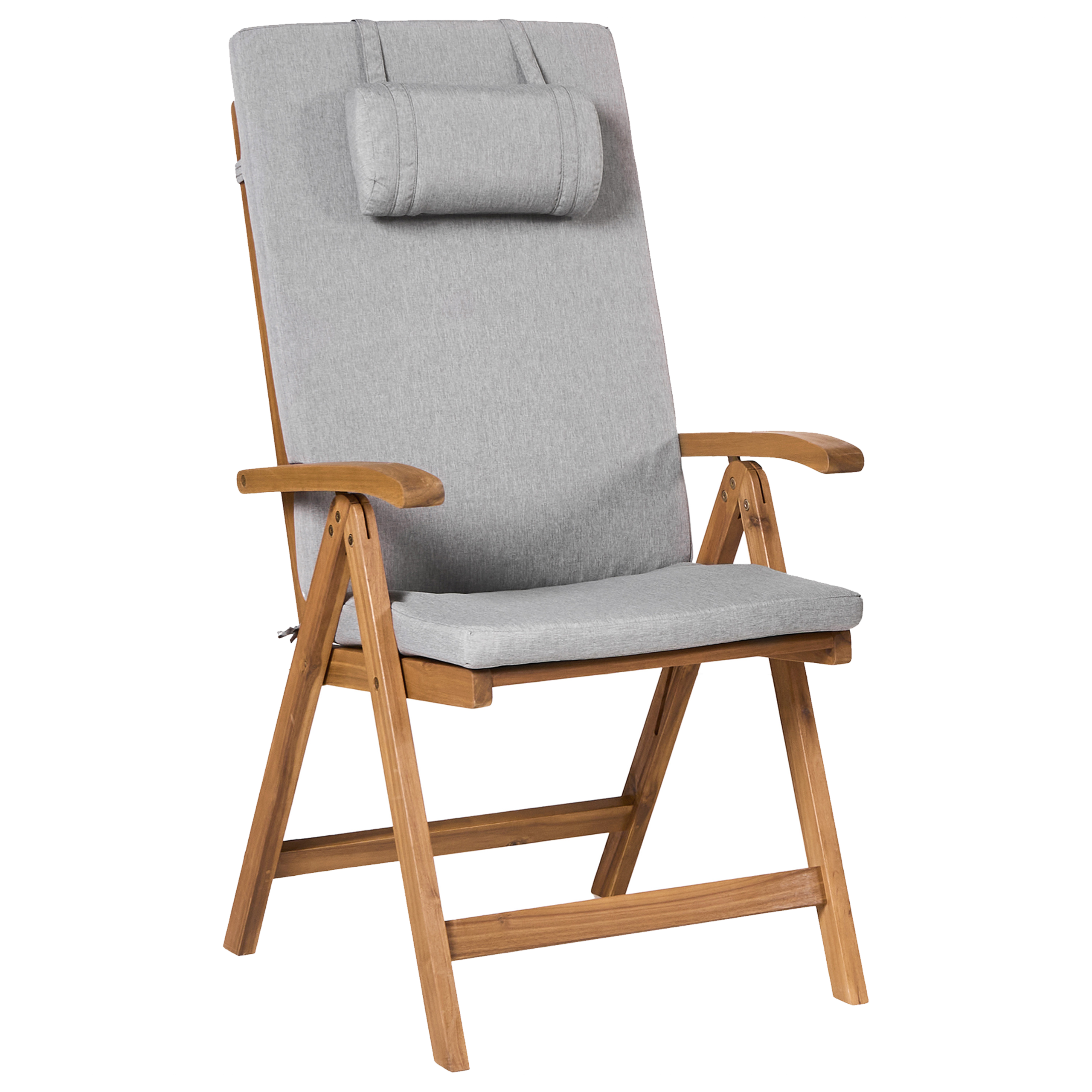 Kokoontaitettava puutarhan tuolisetti tyynyillä. Tämä kahden puutarhatuolin setti on täydellinen lisä mihin tahansa ulkotilaan, sulautuen erinomaisesti etenkin perinteisiin sisustuksiin. Luonnollisesta akaasiapuusta valmistetut tuolit ovat erittäin tukevia ja kestävät pitkäaikaista käyttöä sekä vaihtelevia sääolosuhteita. Kuuteen asentoon säädettävä selkänoja varmistaa miellyttävän asennon joka kerta, kun taas kokoontaitettava rakenne helpottaa säilytystä ja säästää tilaa. Mukana tulevat paksusti pehmustetut tyynyt ovat laadukasta ja helppohoitoista polyesterikangasta, ja niiden saumoissa on huolellinen, lähes näkymätön viimeistely. Tyynyt kestävät UV-säteilyä, joten väri säilyttää rikkaan sävynsä vuosia ja piristää ulkotilaa.