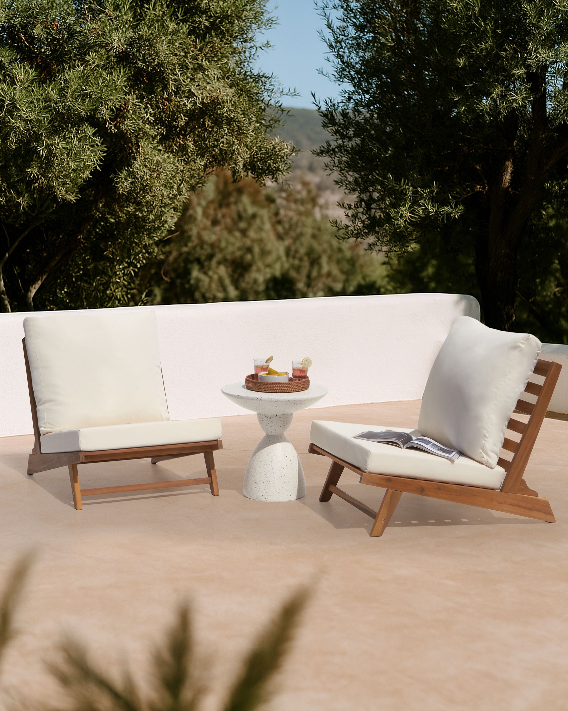 Rustiikkinen puutarhan tuolisetti pehmusteilla. Rentoudu tyylikkäästi näissä rustiikkisissa, akasiapuusta valmistetuissa puutarhatuoleissa, joiden kaltevat muodot sopivat täydellisesti rentoon oleskeluun. Niiden tukeva runko takaa vakauden, kun taas muhkeat luonnonvalkoiset pehmusteet tarjoavat poikkeuksellisen mukavuuden. Tuolit ovat helppohoitoisia, ja niiden pehmusteiden päälliset ovat irrotettavissa. Muotoilunsa ansiosta ne sopivat täydellisesti hiljaiseen hetkeen kirjan parissa, lempijuoman siemailuun auringosta nauttiessa tai vain raikkaassa ulkoilmassa oleskeluun.