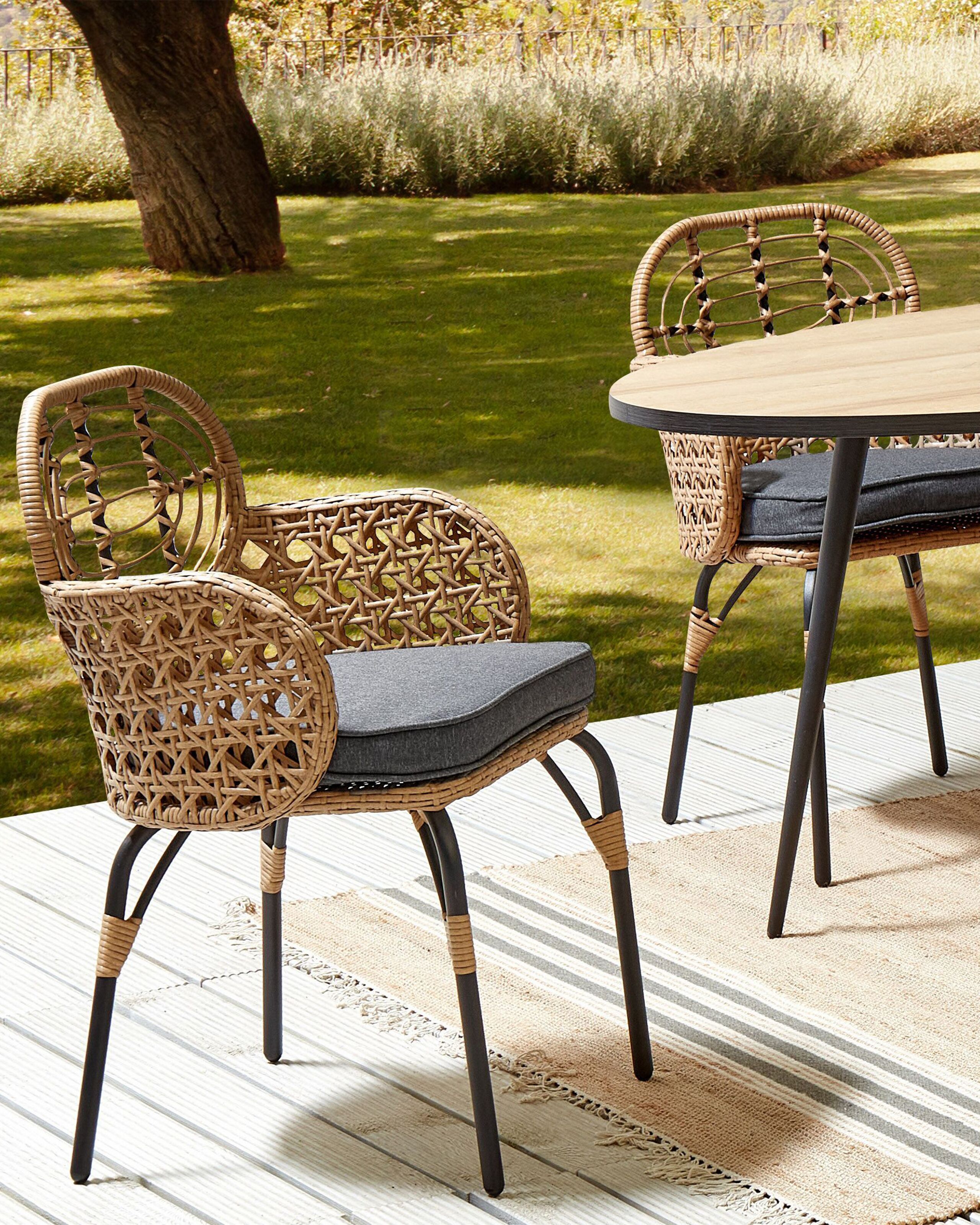 Boheemit ulkotuolit keinorottinkipunoksella. Valmistele ulkotila lämpimiin kesäpäiviin tällä tyylikkäällä puutarhatuolisetillä, jotta voit nauttia yhdessäolosta perheen ja ystävien kanssa. Kestävistä materiaaleista valmistetuissa tuoleissa on viehättävät selkä- sekä käsinojat, jotka on punottu taidokkaasti polyrottingista. Lisäksi kunkin tuolin mukana tulee paksusti pehmustettu grafiitinharmaa istuintyyny, jonka ansiosta ne ovat mukavat ja sopivat täydellisesti pidempiinkin istuskeluihin. Väriyhdistelmän ja luonnon inspiroiman muotoilun ansiosta setti sopii erinomaisesti monenlaisiin sisustuksiin.
