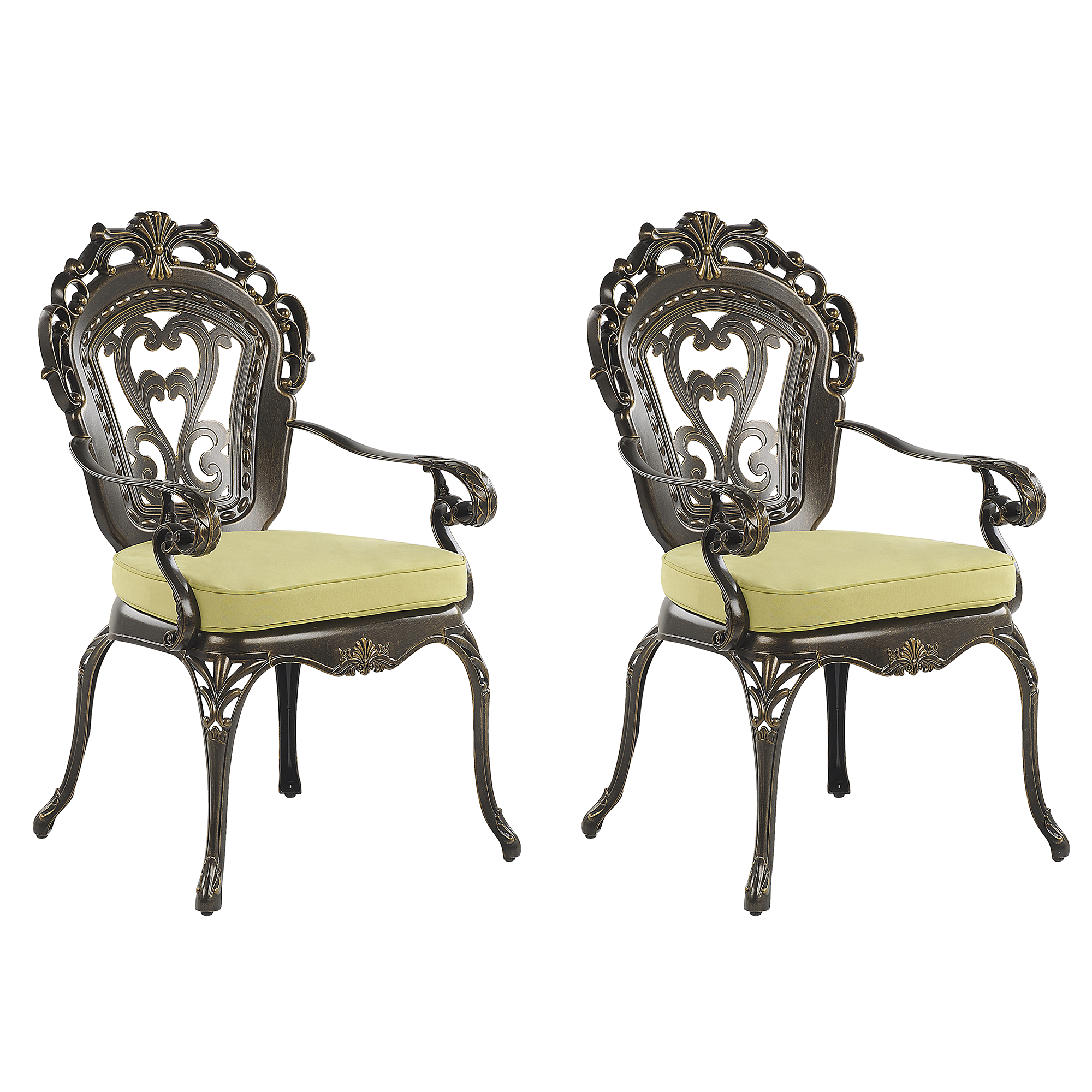 Moderni harmaa ruokapöydän tuoli 4kpl. Tuo ulkotilaasi vintage-vaikutteita tällä tyylikkäällä kahden puutarhatuolin setillä. Kevyet mutta kestävät tuolit on valmistettu alumiinista, joiden kauniit kaarevat linjat, ainutlaatuiset kuvioinnit ja ruskea viimeistely antavat puutarhatuoleille ylellisen, retrohenkeä uhkuvan ilmeen. Mukana tulevat vihreän väriset, paksut pehmusteet takaavat lisämukavuuden. Pehmusteiden päälliset ovat helposti irrotettavissa pesua varten.