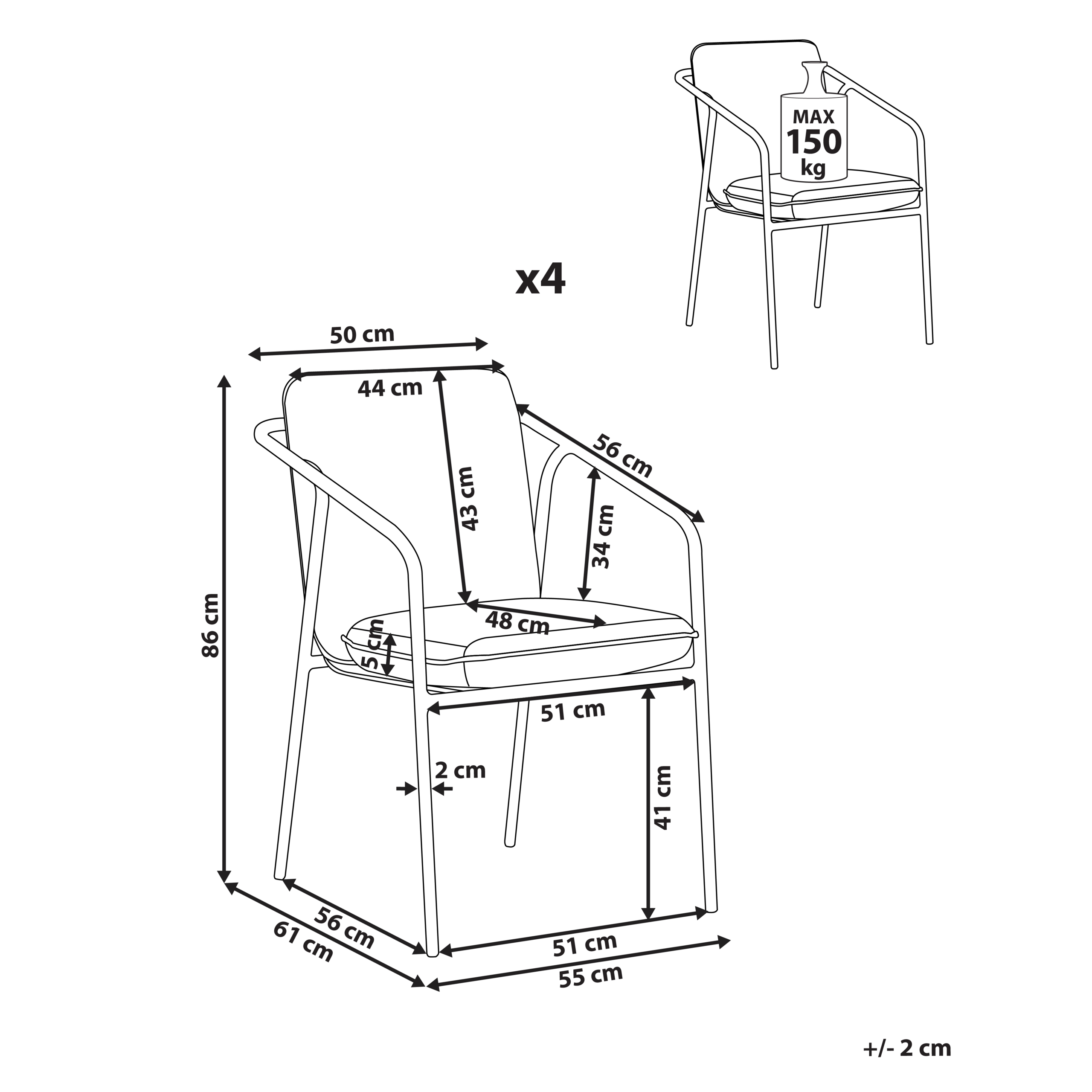 Minimalistiset ulkotuolit pehmusteilla. Tämä neljän puutarhatuolin setti yhdistää minimalistisen muotoilun ja korkean toiminnallisuuden. Vankat, valkoiseksi jauhemaalatut metallirungot takaavat kestävyyden ulkoisia tekijöitä ja korroosiota vastaan. Paksut, mukavat pehmusteet täydentävät täydellisesti tuolien modernia muotoilua. Pinottavuutensa ansiosta ne ovat ihanteellinen ratkaisu kaikille, jotka arvostavat helppoa säilytystä.