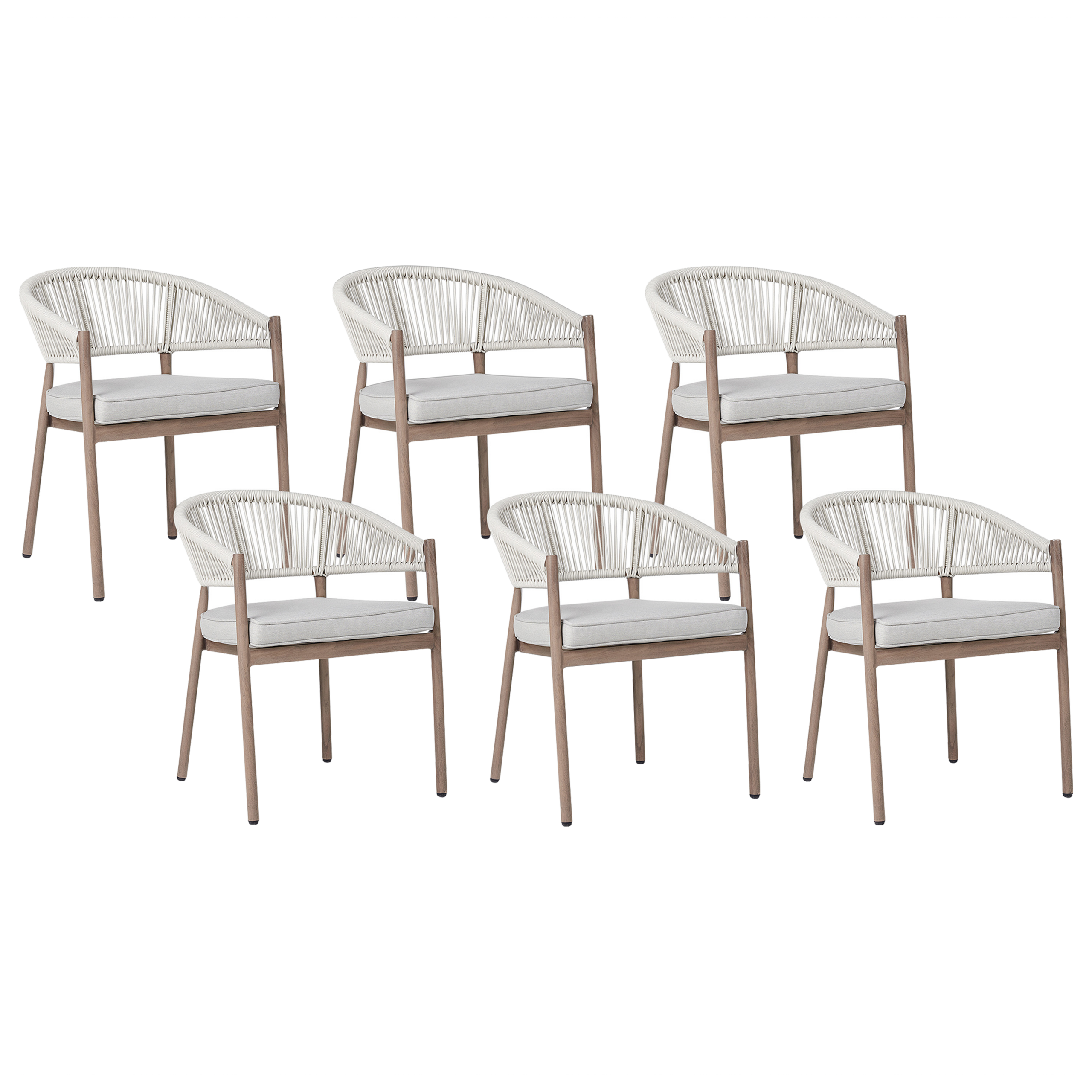 Moderni puutarhatuolisetti pehmusteilla. Kohota ulkoruokailualuetta tällä kevyestä mutta kestävästä alumiinista valmistetulla kuuden puutarhatuolin setillä, joissa on kaunis, luonnollista puuta jäljittelevä lämpösiirtotekniikalla luotu kuvio. Tämä pinnoite parantaa tuolien ulkonäköä ja kestävyyttä sääolosuhteita vastaan. Narupunotut selkänojat lisäävät modernia ilmettä, ja istuintyynyt irrotettavilla päällisillä tarjoavat mukavuutta. Tuolit on suunniteltu pitkäikäisiksi ja tarjoavat erinomaisen UV-kestävyyden sekä vedenpitävyyden, mikä tekee niistä sopivia ympärivuotiseen käyttöön. Pinottava ominaisuus helpottaa säilyttämistä.
