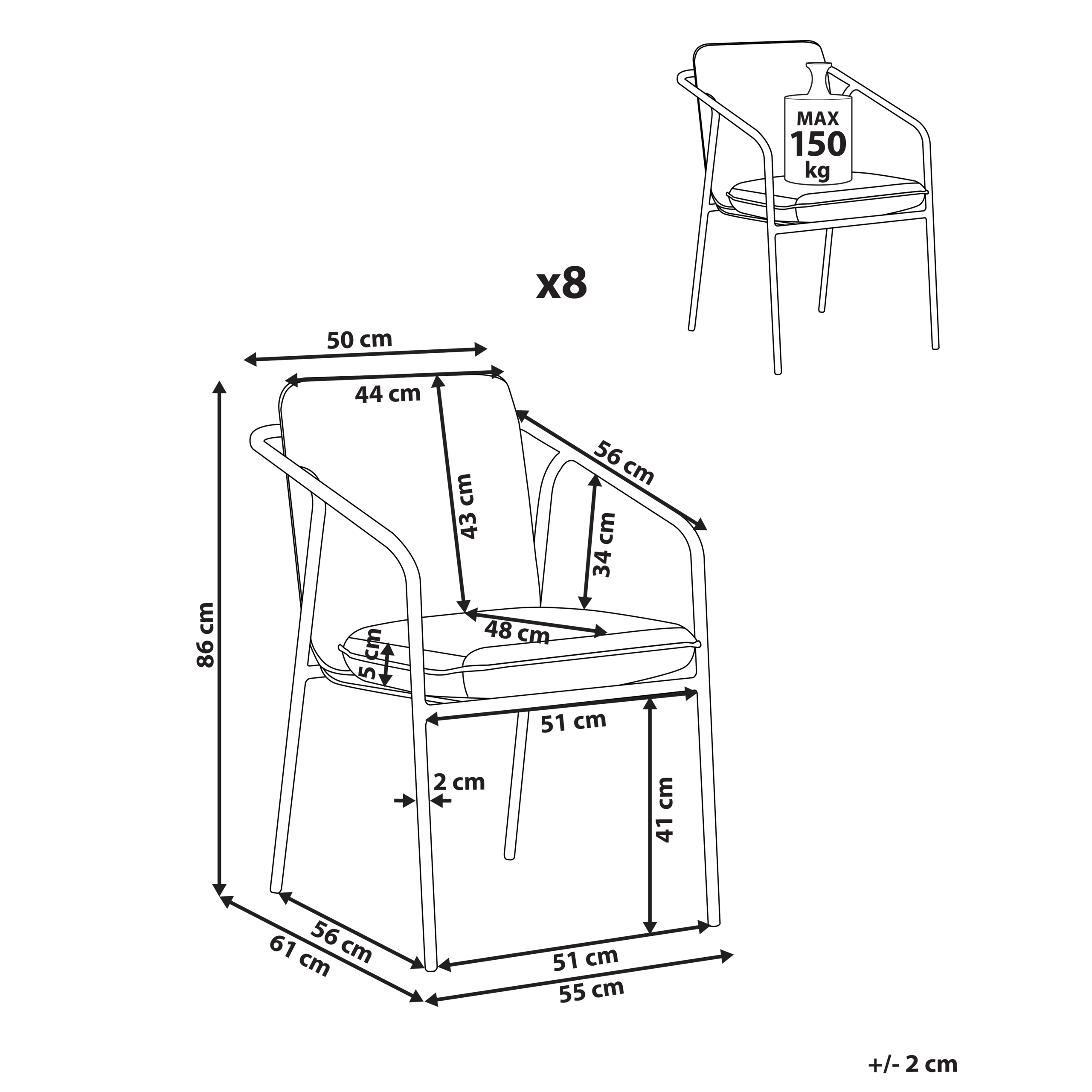 Hintaan sisältyy: 8 x Tuoli, 8 x Istuintyyny, 8 x Selkänojan tyyny