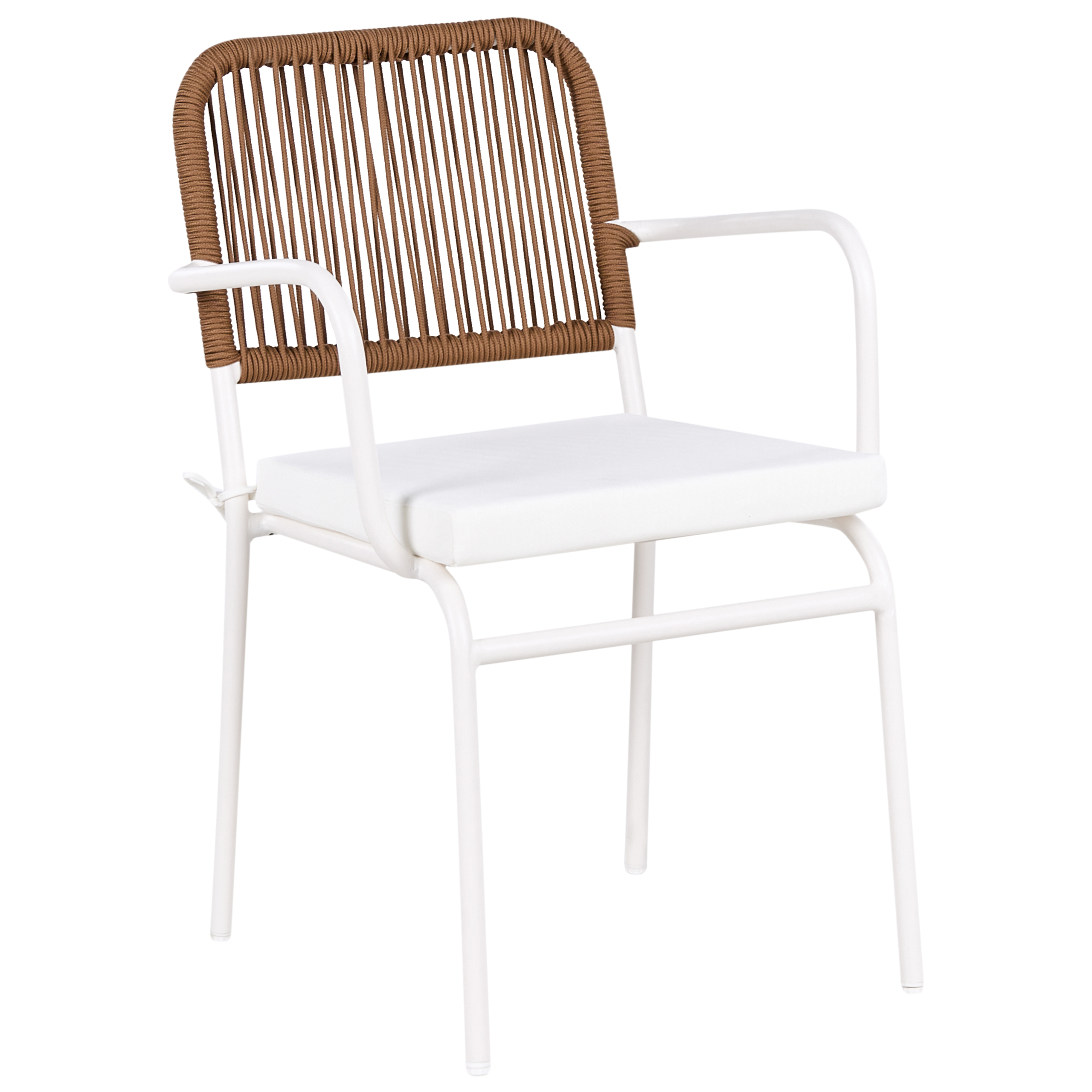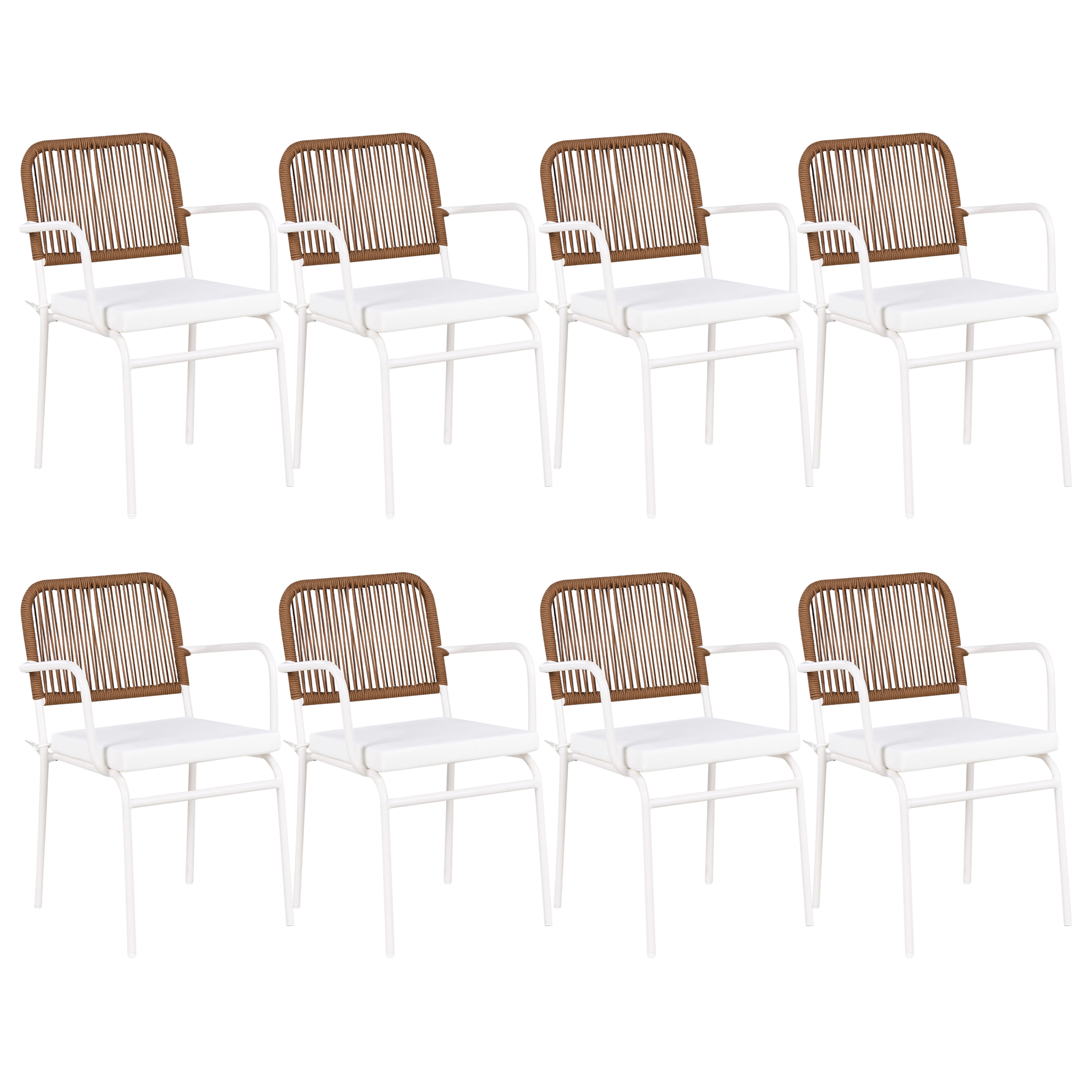 Pinottavat ulkotuolit punotuilla selkänojilla. Tämä kahdeksan tuolin setti on erinomainen valinta terassille, parvekkeelle tai puutarhaan. Tuolit on valmistettu kestävästä, valkoiseksi jauhemaalatusta alumiinista, ja ne kestävät korroosiota, kosteutta ja UV-säteilyä, mikä takaa pitkäaikaisen käytön. Tyylikkäät ruskeat punotut selkänojat ja pehmeät istuintyynyt takaavat mukavan istumiskokemuksen. Niiden moderni muotoilu sopii mihin tahansa ulkotilaan.
