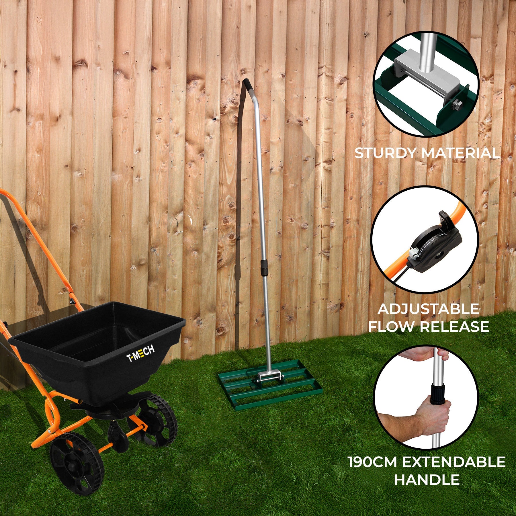 Muuta ulkotilasi tällä nurmikon tasoittajan ja levittimen paketilla, joka on täydellinen kaksikko täydellisen tasaisen nurmikon saavuttamiseen ja sen ylläpitoon ympäri vuoden. Maaperän tasoittamisesta ja maan valmistelusta lannoitteiden, hiekan tai soran levittämiseen, tämä paketti yhdistää tehokkuuden, kestävyyden ja helppokäyttöisyyden kaikkiin nurmikonhoitotarpeisiisi.