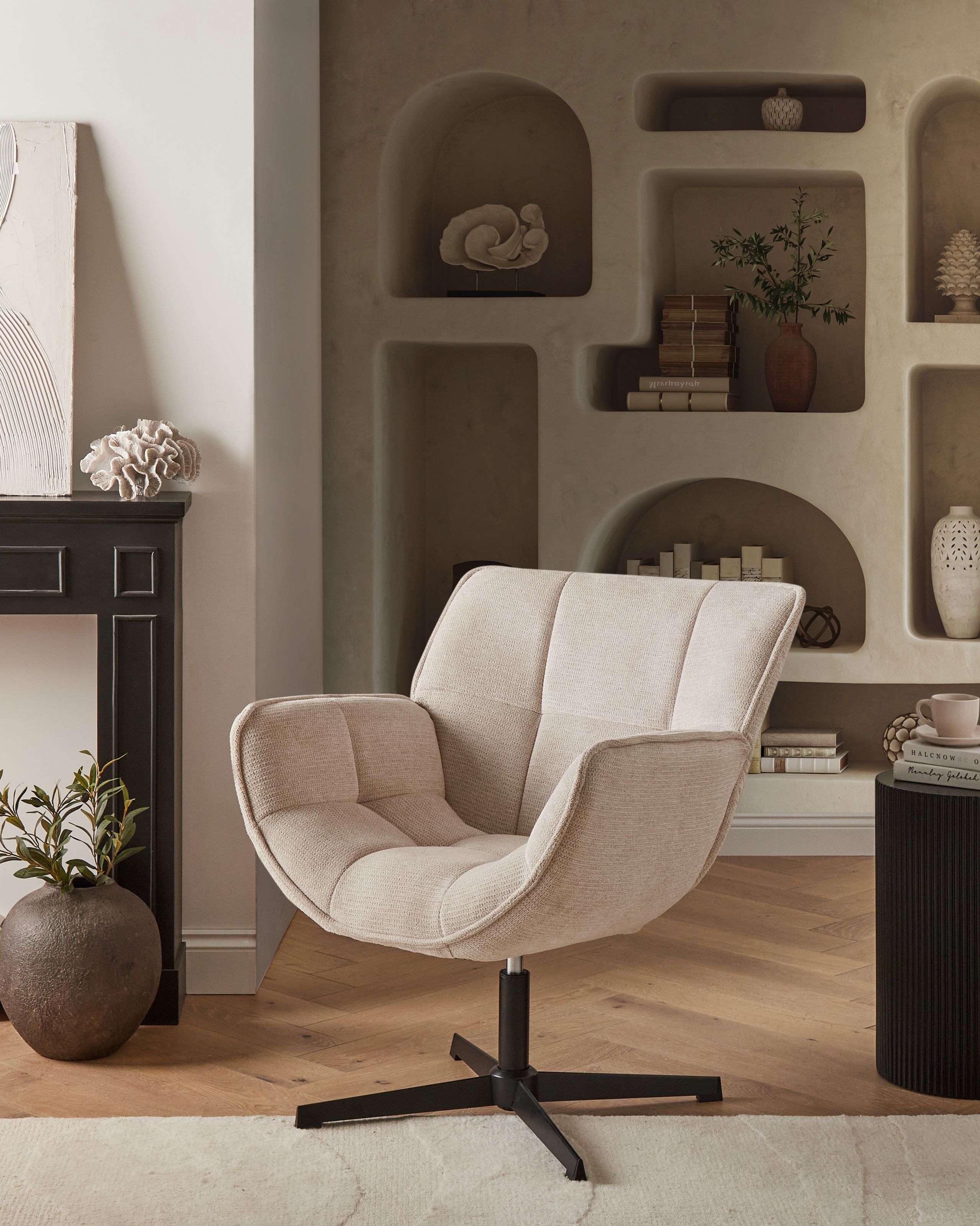 Retrotyylinen pyörivä lepotuoli kaarevalla istuimella. Lisää tilaan ripaus retroa charmia tällä tyylikkäällä nojatuolilla. Pehmeällä, teksturoidulla polyesterikankaalla verhoiltu ja runsaasti pehmustetut istuin, selkänoja ja käsinojat tarjoavat sekä mukavuutta että luonnetta. Klassinen, vuosisadan puolivälin siluetti on tuettu tyylikkäällä mustalla metallijalustalla, joka pyörii 360 astetta käytännöllisyyden lisäämiseksi. Sopii erinomaisesti lukunurkkaukseen, kotitoimistoon tai olohuoneeseen.