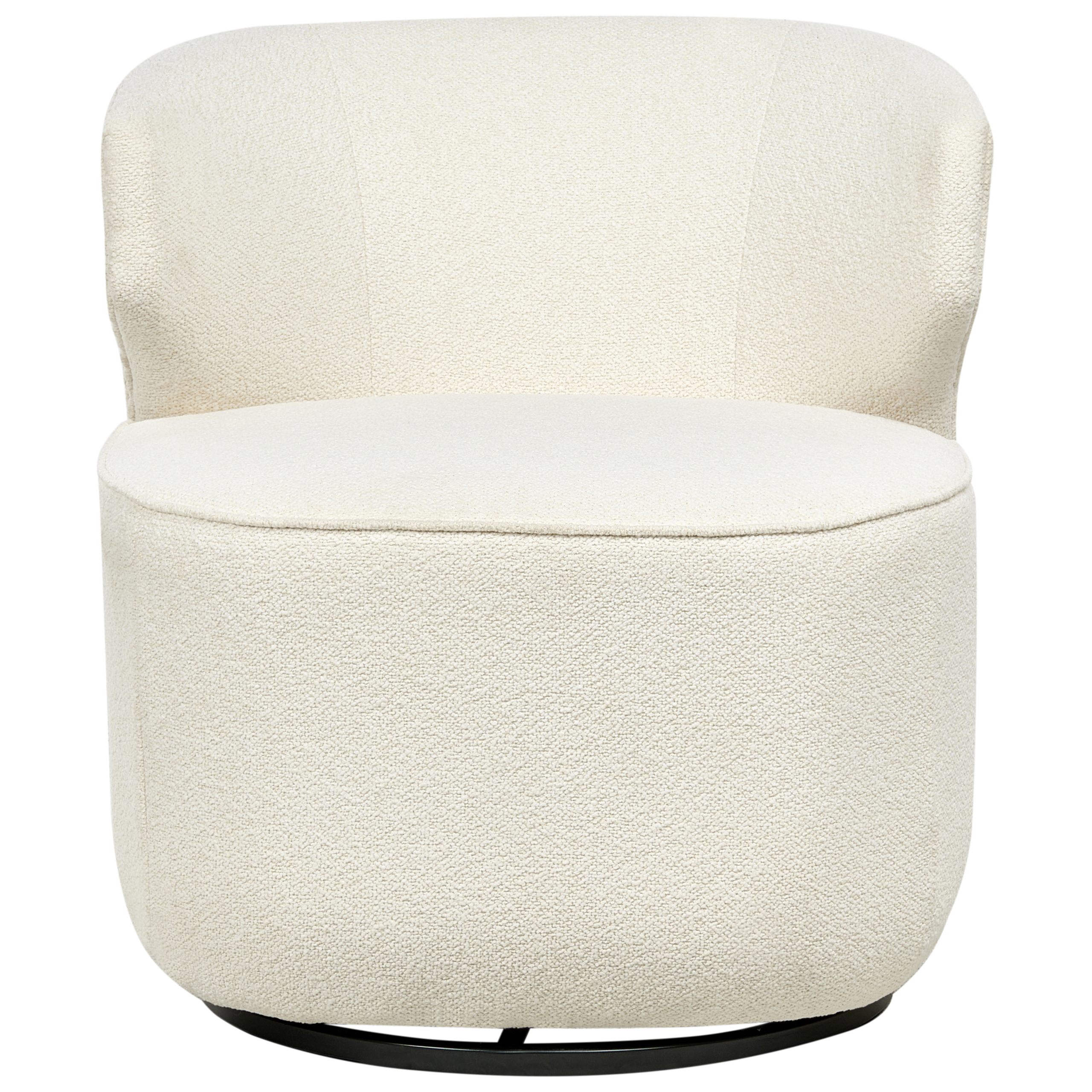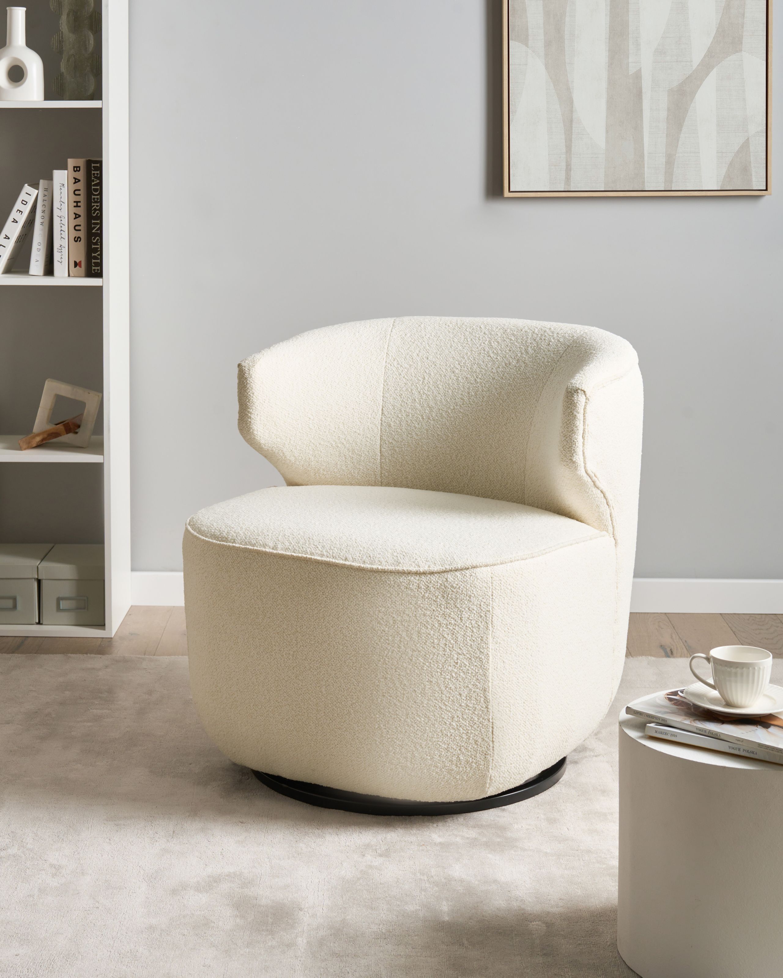Minimalistinen pyörivä nojatuoli. Tämä nojatuoli on toimiva ja tyylikäs lisä mihin tahansa sisustukseen. Pehmeä luonnonvalkoinen bukleeverhoilu tuo kodikasta ja kutsuvaa tunnelmaa, kun taas pyöristetty muoto ja matala selkänoja kohottavat mukavuutta. Pyörimistoiminto mahdollistaa vaivattoman kääntymisen ilman että tuolia tarvitsee siirtää. Musta rautajalka lisää vakautta ja luo hienovaraisen kontrastin. Nojatuolin muotoilu ja viimeistely tuovat tilaan industriaalista mutta viihtyisää särmää.