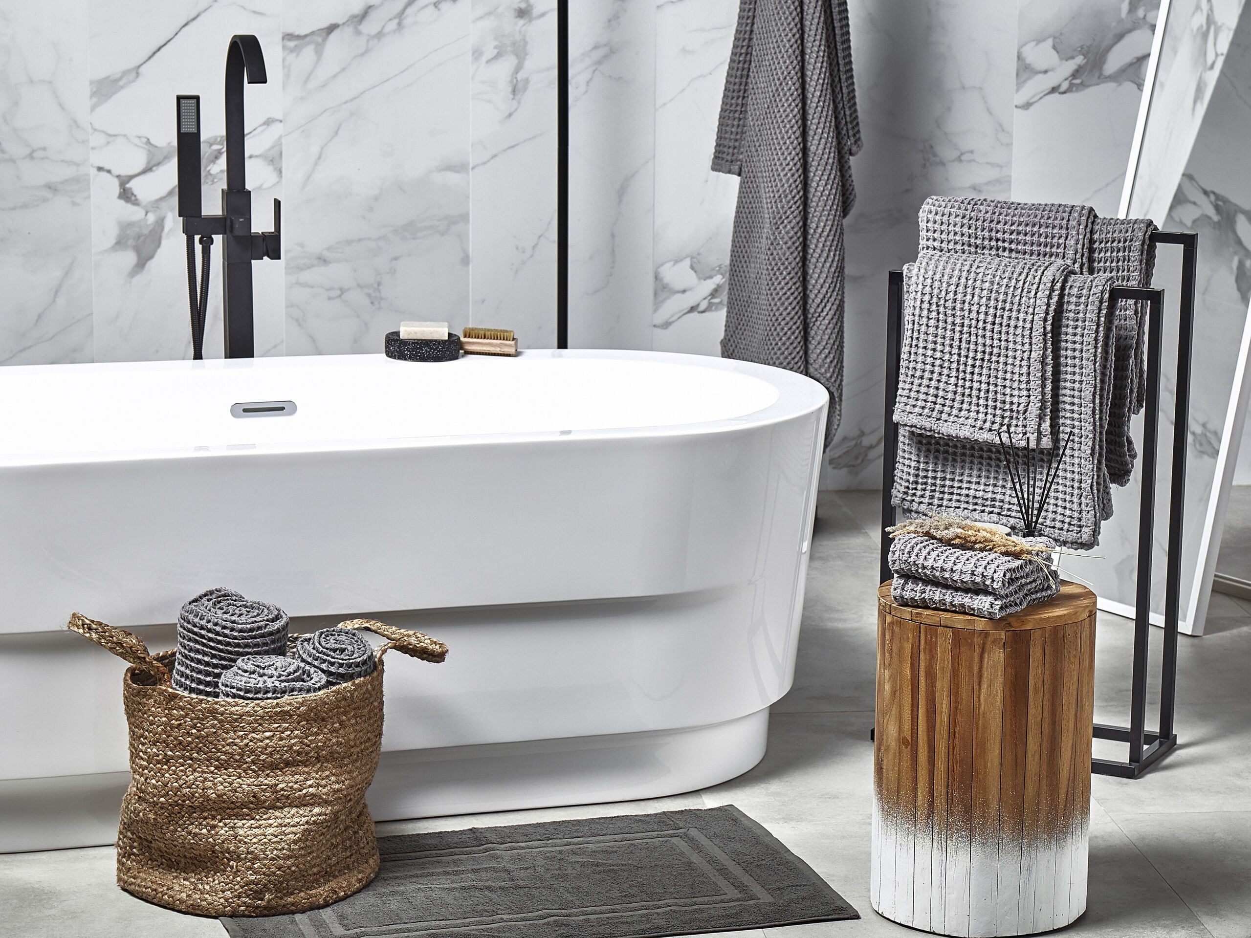 Kaunis 11-osainen vohvelipyyhesetti. Näihin vohvelipyyhkeisiin ihastut varmasti heti ensikosketuksella. Luonnollisesta, konepesun kestävästä puuvillasta valmistettujen pyyhkeiden hunajakennomainen rakenne antaa niille ylellisen ilmeen, tehden niistä täydellisiä niin vieraille kuin jokapäiväiseen käyttöön. Ilman kierrettä kudotut langat ja tiheät kuidut tekevät pyyhkeistä erittäin pehmeitä ja lämpimiä. Tekstuurinsa ansiosta ne poistavat kosteuden iholta helposti ja kuivuvat nopeasti. Pyyhesetti sisältää vieraspyyhkeet, käsipyyhkeet, pienet ja isot kylpypyyhkeet sekä yhteensopivan kylpyhuoneen maton.