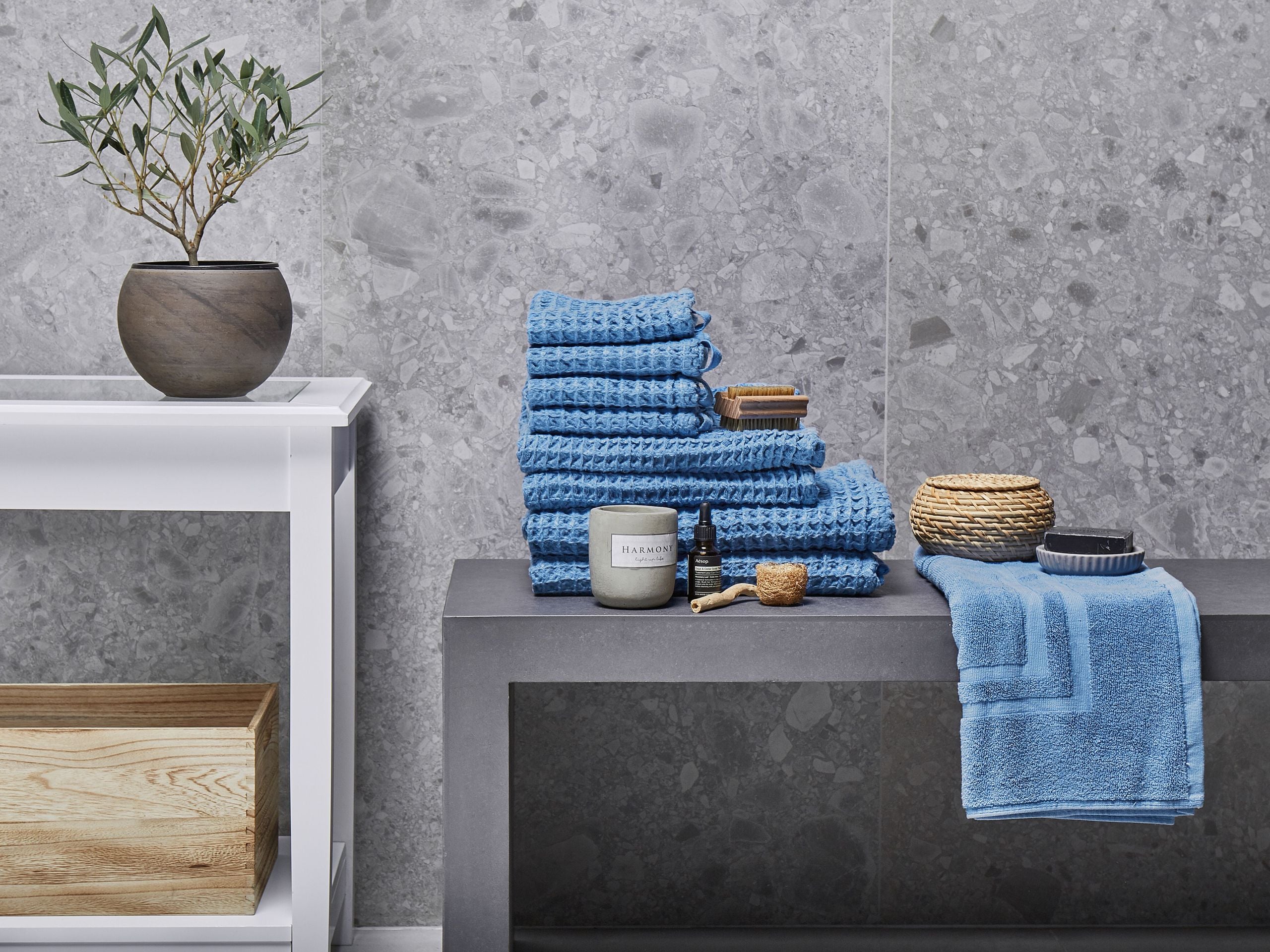 Kaunis 9-osainen vohvelipyyhesetti. Näihin vohvelipyyhkeisiin ihastut varmasti heti ensikosketuksella. Luonnollisesta, konepesun kestävästä puuvillasta valmistettujen pyyhkeiden hunajakennomainen rakenne antaa niille ylellisen ilmeen, tehden niistä täydellisiä niin vieraille kuin jokapäiväiseen käyttöön. Ilman kierrettä kudotut langat ja tiheät kuidut tekevät pyyhkeistä erittäin pehmeitä ja lämpimiä. Tekstuurinsa ansiosta ne poistavat kosteuden iholta helposti ja kuivuvat nopeasti. Pyyhesetti sisältää vieraspyyhkeet, käsipyyhkeet, kylpypyyhkeet ja yhteensopivan kylpyhuoneen maton.