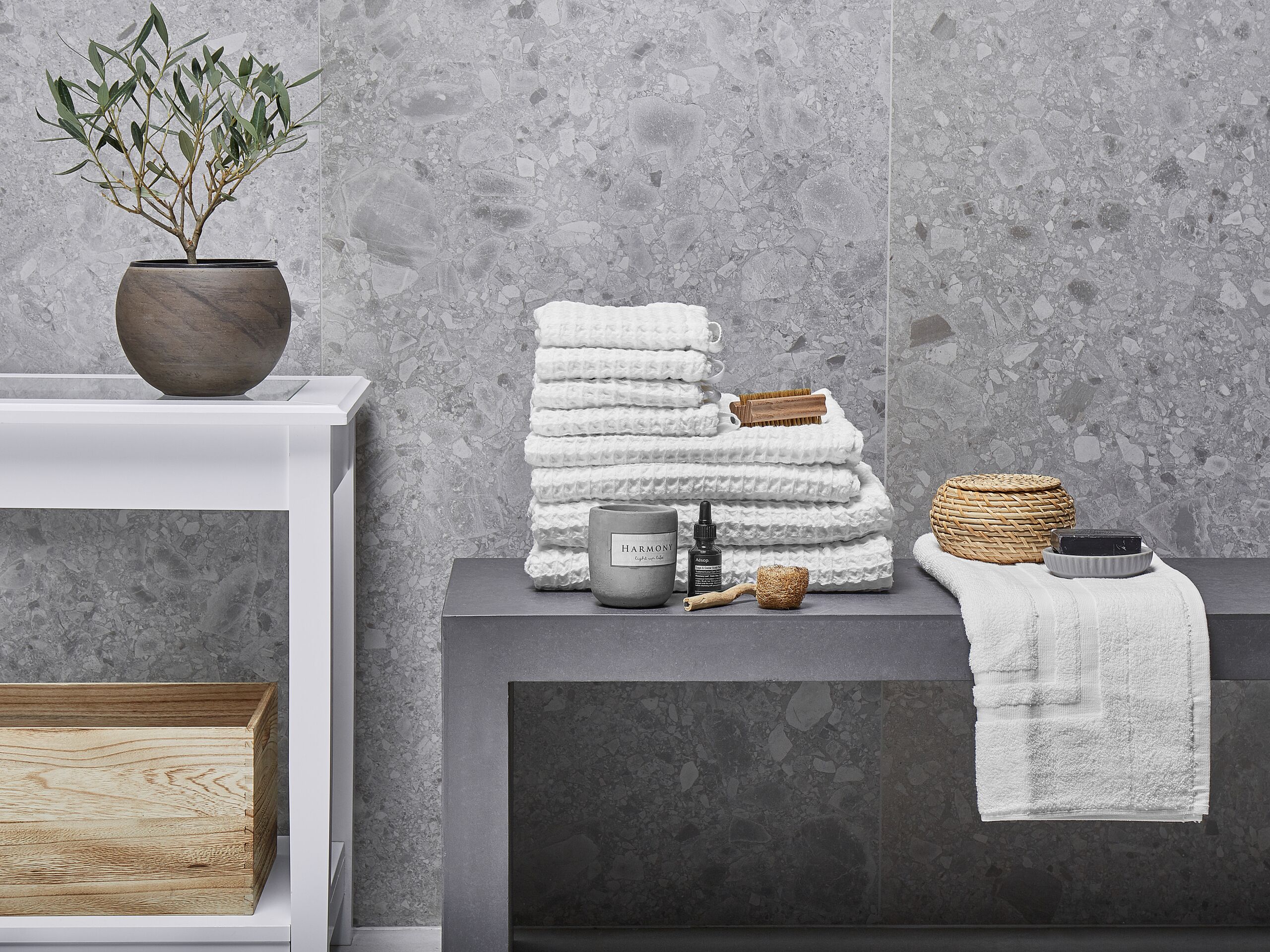 Kaunis 9-osainen vohvelipyyhesetti. Näihin vohvelipyyhkeisiin ihastut varmasti heti ensikosketuksella. Luonnollisesta, konepesun kestävästä puuvillasta valmistettujen pyyhkeiden hunajakennomainen rakenne antaa niille ylellisen ilmeen, tehden niistä täydellisiä niin vieraille kuin jokapäiväiseen käyttöön. Ilman kierrettä kudotut langat ja tiheät kuidut tekevät pyyhkeistä erittäin pehmeitä ja lämpimiä. Tekstuurinsa ansiosta ne poistavat kosteuden iholta helposti ja kuivuvat nopeasti. Pyyhesetti sisältää vieraspyyhkeet, käsipyyhkeet, kylpypyyhkeet ja yhteensopivan kylpyhuoneen maton.