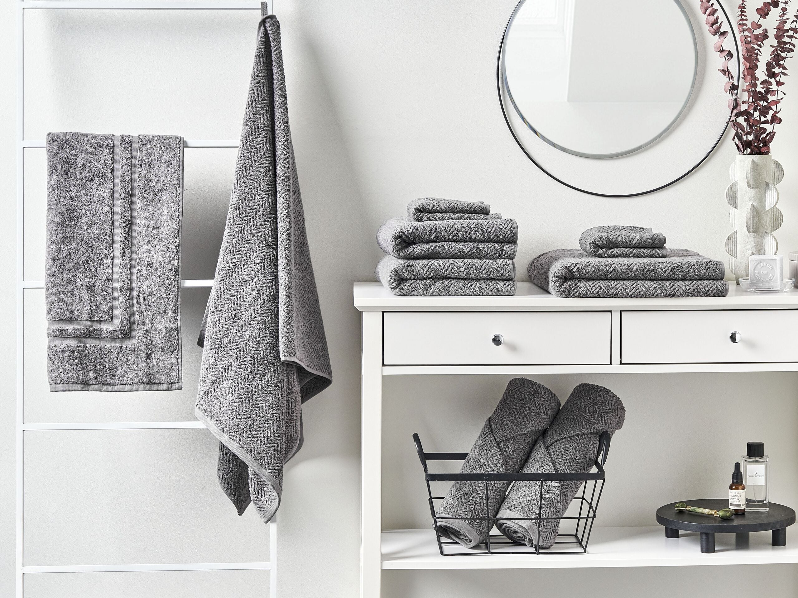 Ylellinen froteepyyhesetti. Hemmottele itseäsi ja vieraitasi tällä uskomattoman pehmeällä froteepyyhesetillä. Pyyhe on 100% puuvillaa, jonka ansiosta se imee vettä hyvin ja kuivuu nopeasti. Frotee on erittäin pehmeä materiaali ja pysyy myös mukavan tuntuisena usean pesukerran jälkeen. Pyyhkeissä on kaunis siksak kuvio ja reunat on viimeistelty siististi elegantin ilmeen takaamiseksi.