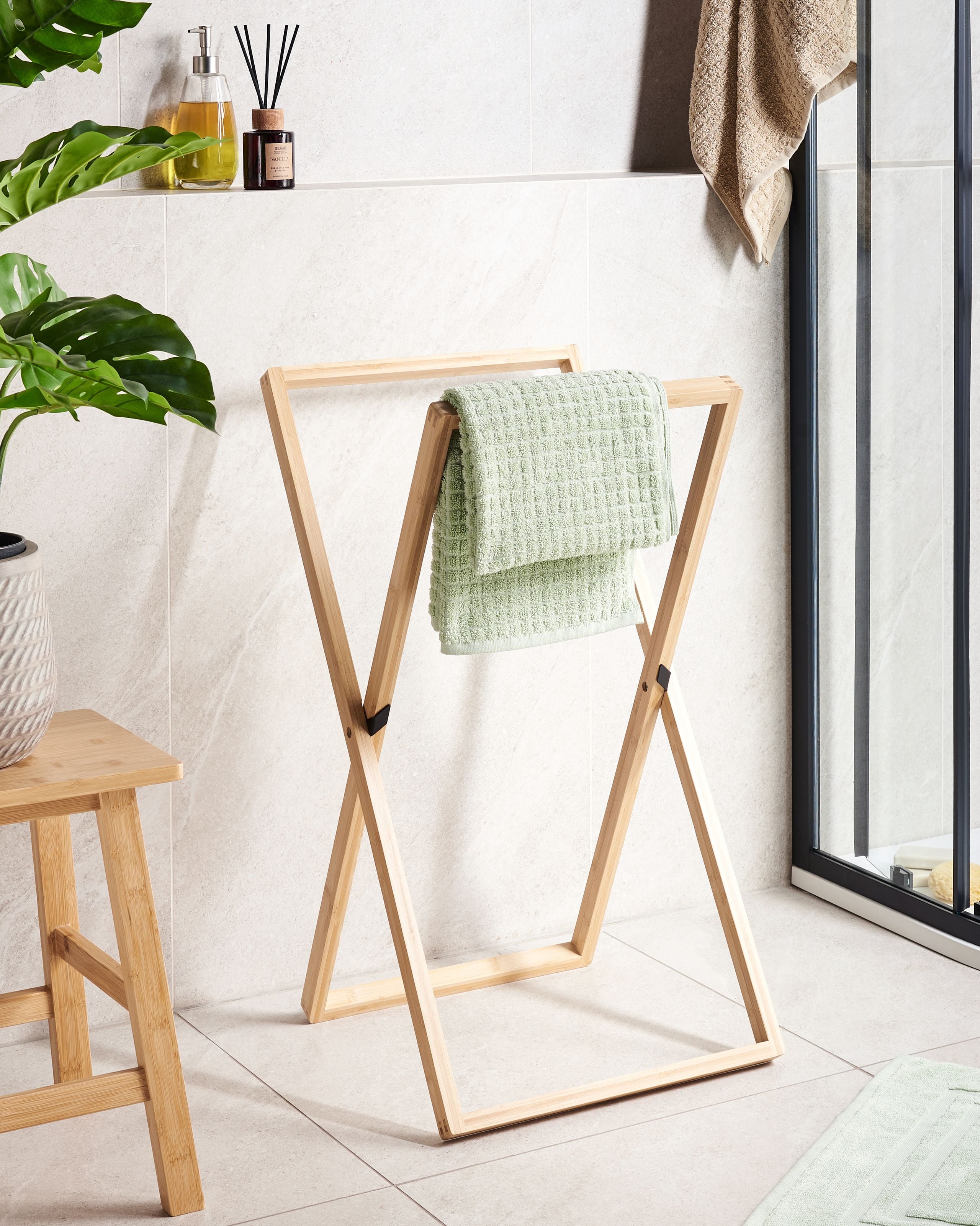 Minimalistinen kokoontaitettava pyyheteline. Kalusta kylpyhuoneesi tällä tyylikkäällä X-muotoisella pyyhetelineellä, joka sopii täydellisesti pyyhkeiden kuivaamiseen. Laadukkaasta bambusta valmistettu teline on sekä kestävä että kevyt, ja lämpimän sävynsä ansiosta se tuo huoneeseen luonnollista ilmettä. Kokoontaitettava muotoilu varmistaa vaivattoman säilytyksen, säästäen tilaa pienemmissä kylpyhuoneissa. Kompakti ja käytännöllinen pyyheteline on kätevä valinta kylpyhuoneeseen tai muuhun kodin tilaan.