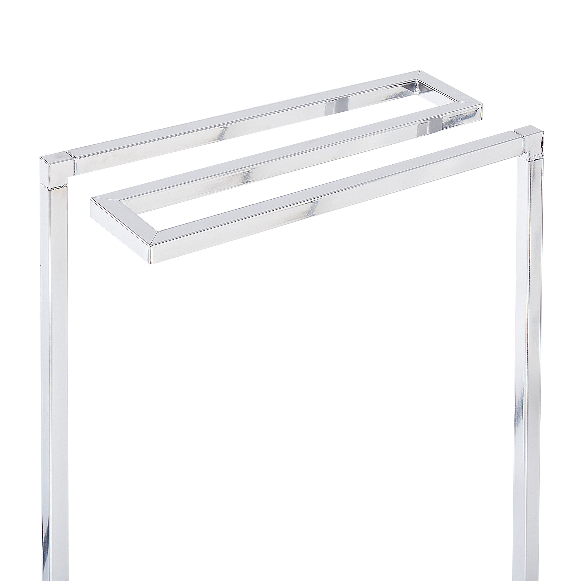 Vapaasti seisova pyyheteline moderni tyyli. Pidä kylpyhuoneesi siistinä ja käytännöllisenä. Pyyhetelineen avulla saat kuivatettua ja säilöttyä märät pyyhkeet suihkun tai kylvyn jälkeen. Pyyheteline on metallia ja pysyy pystyssä neliskulmaisen pohjan avulla, mihin ikinä haluatkaan sijoittaa sen. Kiiltävä pinnoite luo loppusilauksen kylpyhuoneesi sisustukseen.