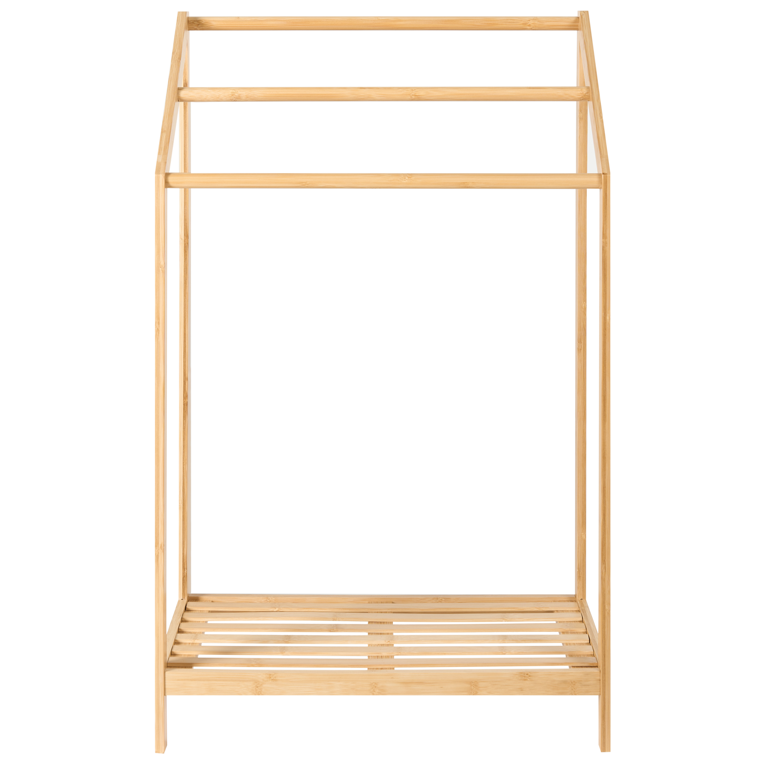 Minimalistinen pyyheteline hyllyllä. Tämä virtaviivainen, bambusta valmistettu pyyheteline tarjoaa täydellisen tavan pitää kylpyhuoneen järjestyksessä, yhdistäen tyylin ja toiminnallisuuden. Telineen alaosassa on kätevä hylly, joka tarjoaa paikan viikatuille pyyhkeille tai muille tarvikkeille. Kolme tankoa on suunniteltu pyyhkeiden helppoa ripustamista ja kuivaamista varten. Japanilaisvaikutteinen moderni muotoilu tuo minimalistista ja selkeää ilmettä, joka täydentää mitä tahansa kylpyhuoneen sisustusta.