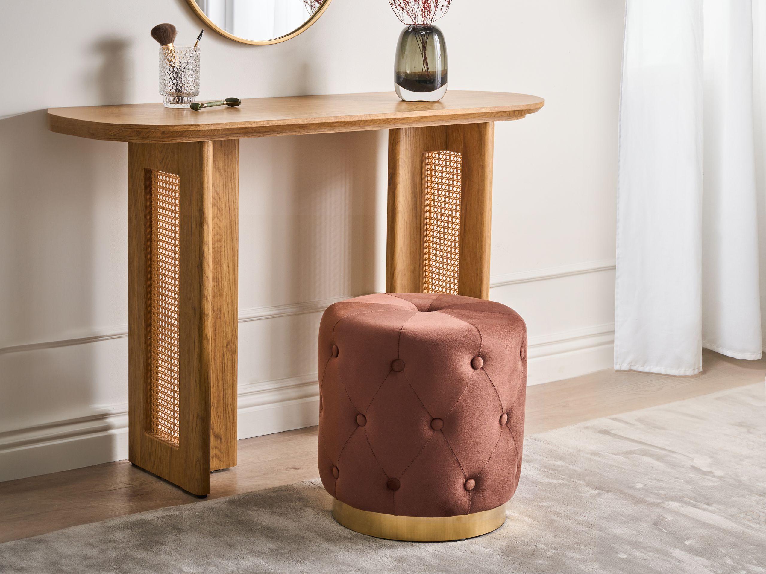 Kaunis nappikoristeltu rahi. Tämä elegantti rahi kohottaa mitä tahansa modernia tai perinteistä olohuonetta, makuuhuonetta tai eteistä. Lämmin, pehmeä samettiverhoilu muuttaa sävyään hienovaraisesti katselukulmasta ja valaistuksesta riippuen, mikä tuo sisustukseen syvyyttä ja harmoniaa, luoden samalla dynaamisen ja ikityylikkään ilmeen. Verhoilu on viimeistelty kauniilla tikkauksella ja koristenapeilla, ja vakaa, kullanvärinen metallijalusta lisää lumoavaa hohtoa. Rahi sopii erinomaisesti kampauspöydän ääreen, nojatuolin jalkatueksi tai koristeelliseksi ja ylelliseksi yksityiskohdaksi.