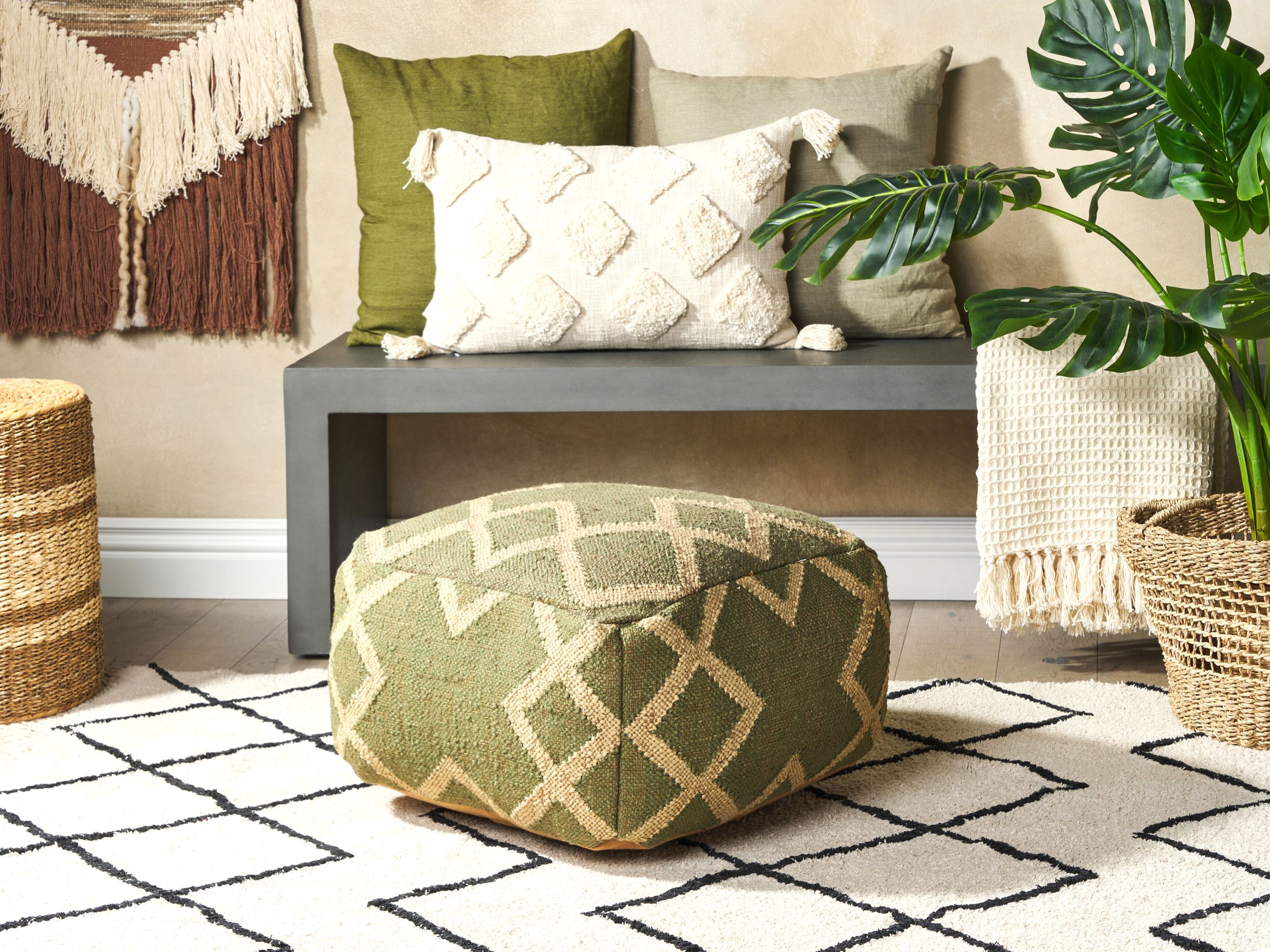 Käsinkudottu Kelim-tyylinen rahi. Tämä neliönmuotoinen rahi tuo luonnollista ilmettä mihin tahansa tilaan. Juutin ja villan sekoituksesta valmistettua päällistä koristaa yksinkertainen mutta tyylikäs geometrinen kuviointi, joka sopii täydellisesti sekä skandinaavisiin että minimalistisiin tiloihin. Koska päällinen on valmistettu käsin panjakudontatekniikkaa käyttäen, jokainen rahi on ainutlaatuinen. Aseta rahi makuuhuoneeseen tai olohuoneeseen ja käytä sitä lisäistuimena tai käytännöllisenä koristeellisena korosteena.