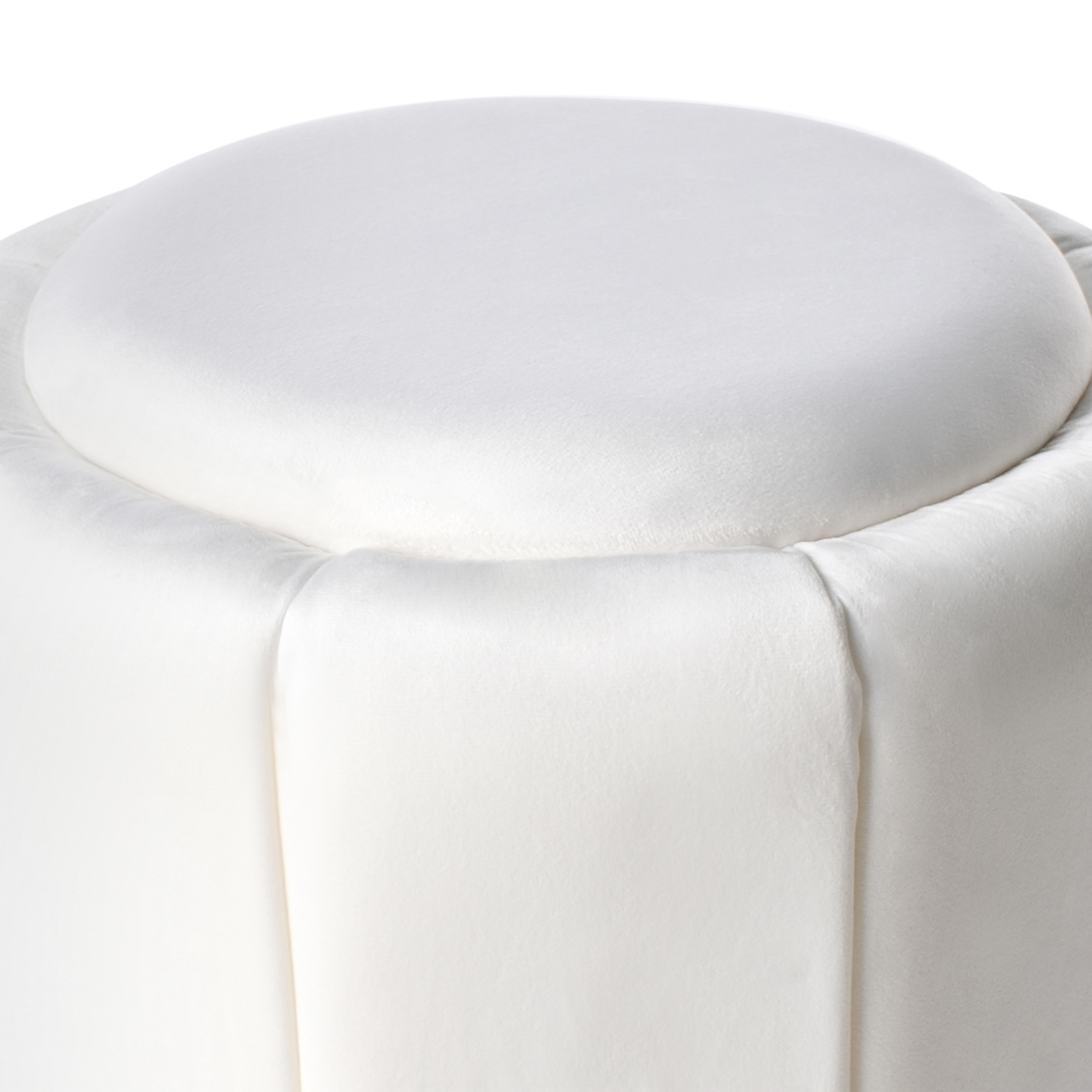 Koristeellinen pyöreä rahi. Lisää olohuoneeseen tai makuuhuoneeseen glamour-tunnelmaa tällä pyöreällä rahilla, joka on viimeistelty koristeellisella tikkauksella. Laadukas valkoinen samettiverhoilu ja kiiltävä kullanvärinen metallijalusta eivät vain kohota mitä tahansa modernia tai retrotyylistä sisustusta, vaan tuovat siihen myös tyylikästä ilmettä. Rahi on monikäyttöinen – voit käyttää sitä mukavana jalkatukena, jakkarana kampauspöydän äärellä tai ylimääräisenä istuimena.