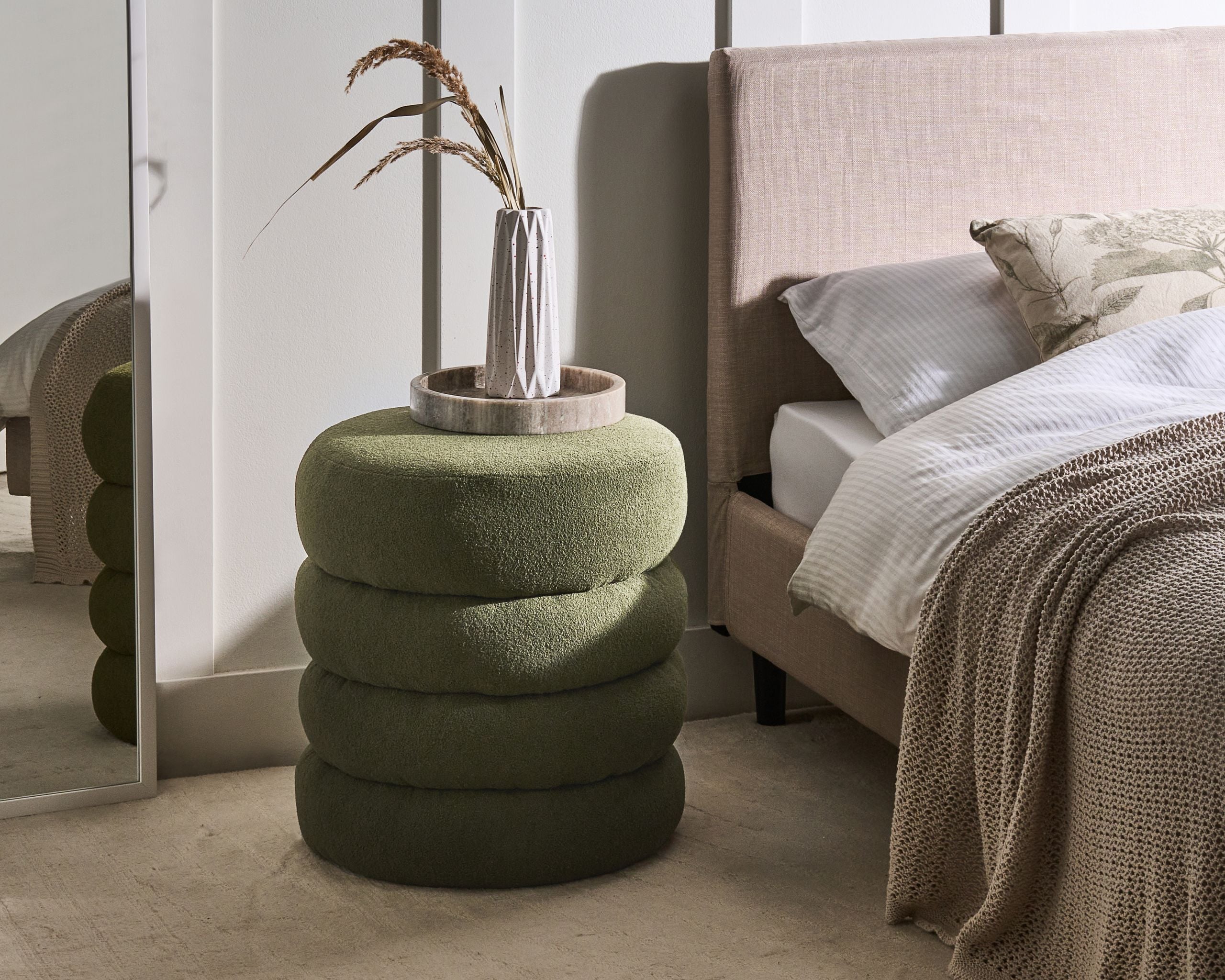Pyöreä verhoiltu rahi. Kohota sisustusta tällä kauniisti muotoillulla rahilla, joka yhdistää modernin tyylin ja monipuolisen toiminnallisuuden. Se on verhoiltu bukleekankaalla, jonka ylellisen pehmeä tekstuuri luo kodikkaan mutta nykyaikaisen tunnelman. Se sopii täydellisesti makuuhuoneeseen, olohuoneeseen sekä luku- tai meikkinurkkaukseen. Kerroksellinen, veistoksellinen siluetti tekee rahista näyttävän korosteen, joka toimii sekä käytännöllisenä sivupöytänä, mukavana jalkatukena että ylimääräisenä istuimena.