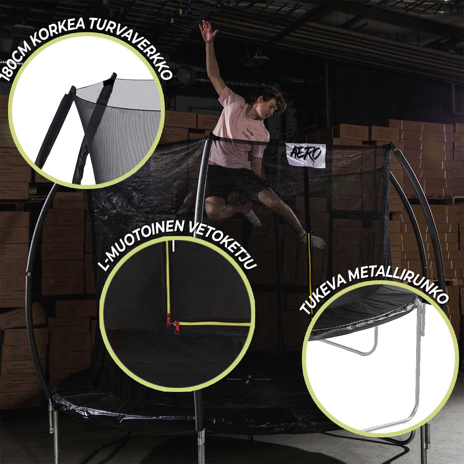 <li><strong>Turvaverkko</strong>: 180 cm korkea, tarjoaa lisäturvaa välttäen putoamiset trampoliinilta.</li>