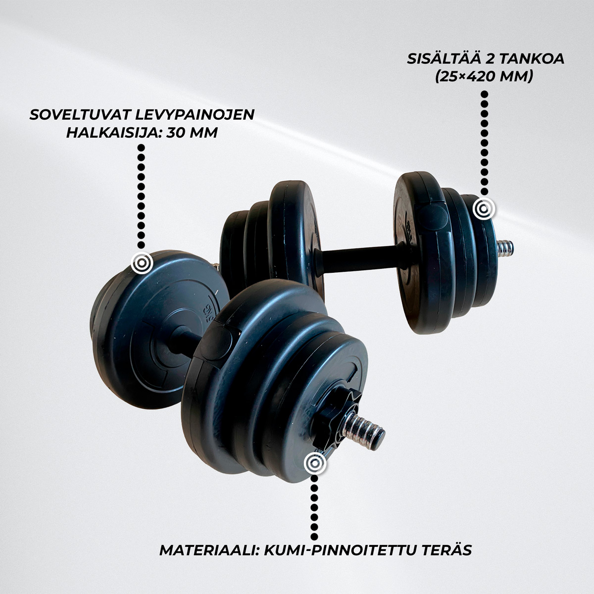 <li><strong>Monipuoliset säädettävät käsipainot</strong>: Sisältää kaiken tarvittavan monipuoliseen harjoitteluun: kaksi tankoa, 4x2.5 kg painolevyt, 4x1.5 kg painolevyt, ja 4x1 kg painolevyt.</li>