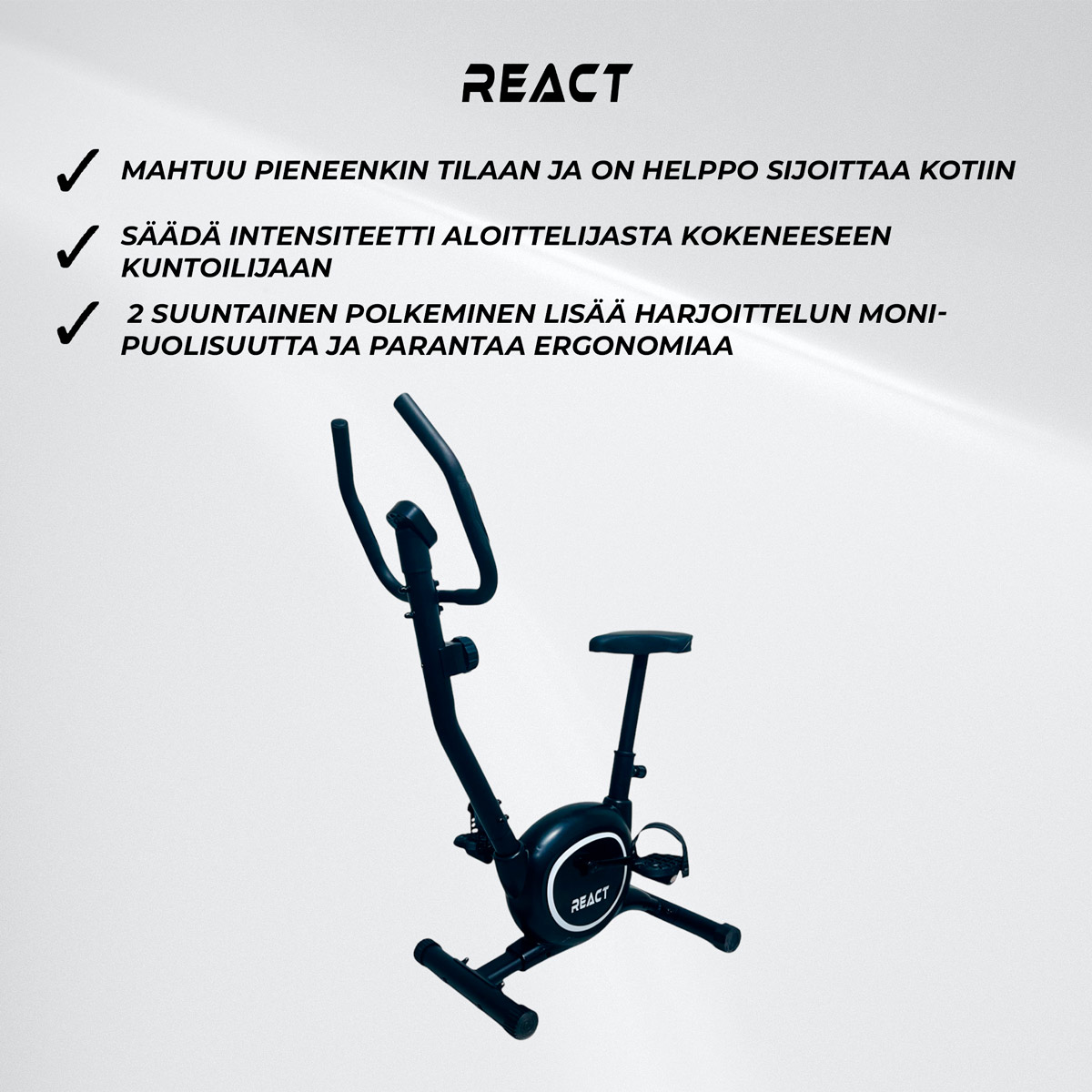 <p>React Kuntopyörä 250 tarjoaa täydellisen ratkaisun kotona pysyvään aktiivisuuteen. Tämän kompaktin kuntopyörän suunnittelussa on kiinnitetty erityistä huomiota tilankäytön tehokkuuteen – kevyt 2,5 kg:n vauhtipyörä ja pyörän mitat (72 cm pituus, 47 cm leveys, 113 cm korkeus) mahdollistavat laitteen sijoittamisen helposti kotisi mihin tahansa kulmaukseen, oli se sitten makuuhuone, olohuone tai kotikuntosali.</p>