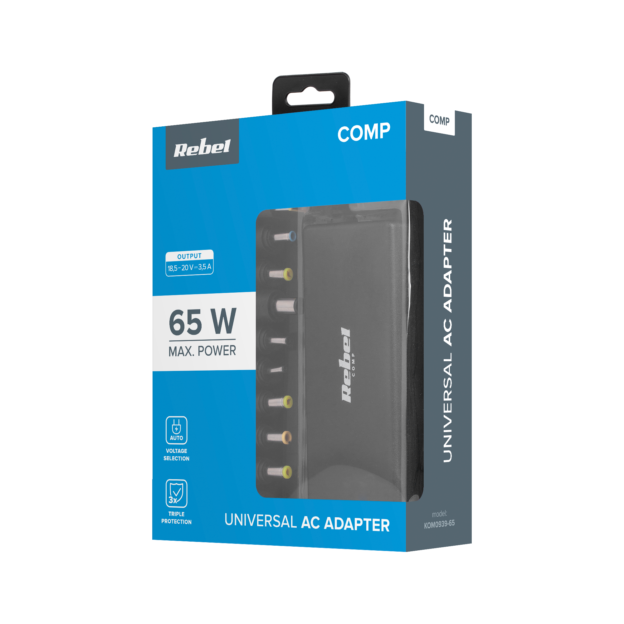 Yleiskäyttöinen 65 W:n virtalähde, jossa automaattinen jännitteen valinta (18–20 V DC). Yhteensopiva HP:n, Compaqin, Acerin, Asuksen, Dellin, Toshiban, Lenovon ja muiden kannettavien tietokoneiden kanssa. Tulojännite 100–240 V AC. Ylikuormitus-, ylijännite- ja ylikuumenemissuoja. Sisältää virtajohdon ja 10 pistoketta: M4, M5, M7, M10, M13, M15, M16, M20, M21, M26. Täydellinen ratkaisu joustavaan ja vakaaseen virransyöttöön.
