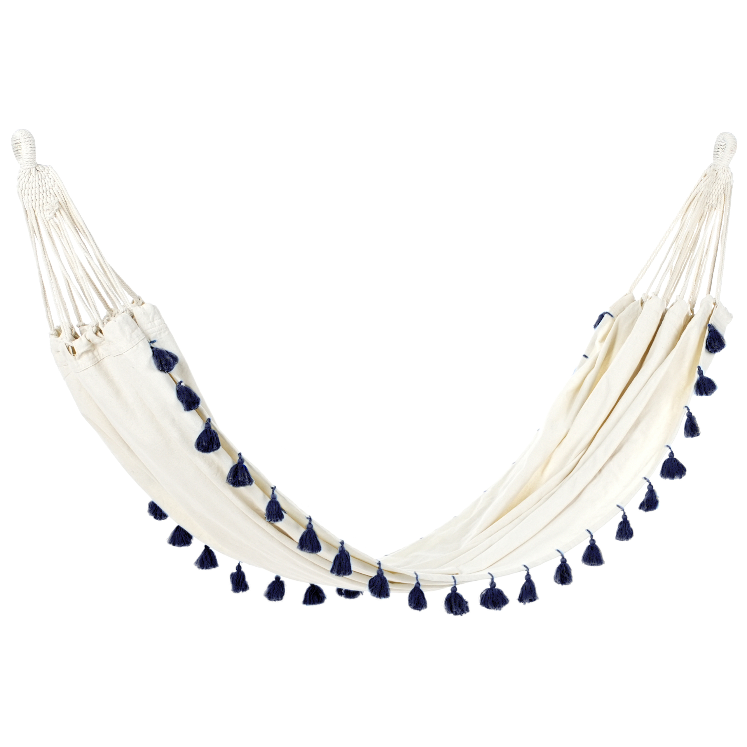 Boheemi riippumatto tupsuilla. Nauti lämpimistä ja aurinkoisista kesäpäivistä tällä kauniilla, boheemilla riippumatolla loikoillen. Korkealaatuisista ja kestävistä materiaaleista valmistettu riippumatto on erittäin pehmeä ja mukava maata, tarjoten leppoisan paikan rentoutua pitkän päivän jälkeen. Reunoja koristavat hurmaavat tummansiniset tupsut, jotka tuovat lisää boho-tyylin hohtoa ja ainutlaatuista ilmettä. Neutraali beige sävy on helppo yhdistää useisiin sisustustyyleihin. Sen mukana tulevat tukevat köydet, jotka mahdollistavat vaivattoman ripustamisen, ja säilytyspussi, joka helpottaa säilytystä.
