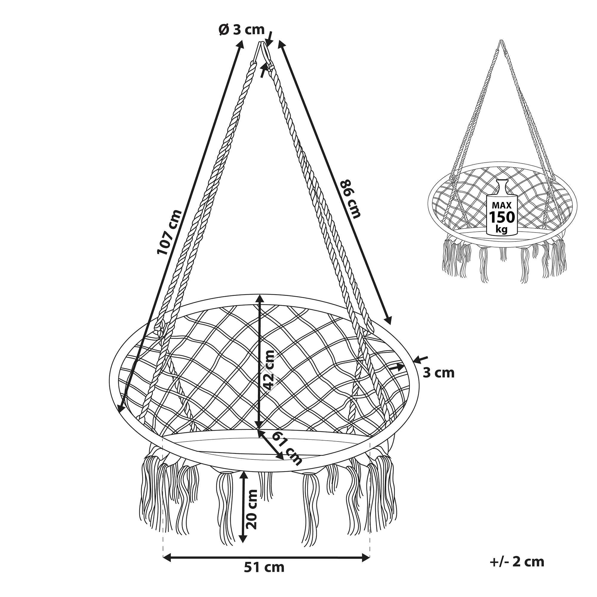 Boho-tyylinen makramee riippukeinu. Nauti keinumisesta sisätiloissa, kuten makuuhuoneessa tai olohuoneessa tällä boho-tyylisessä keinussa. Upeassa rennossa makramee riipputuolissa voit rentoutua ja vaikka lukea kirjaa. Keinun runko on tukeva ja verkko on kudottu makrameesolmuilla puuvillanarusta. Riippukeinu luo rennon ja boho-tyylisen ilmeen sisustukseen.