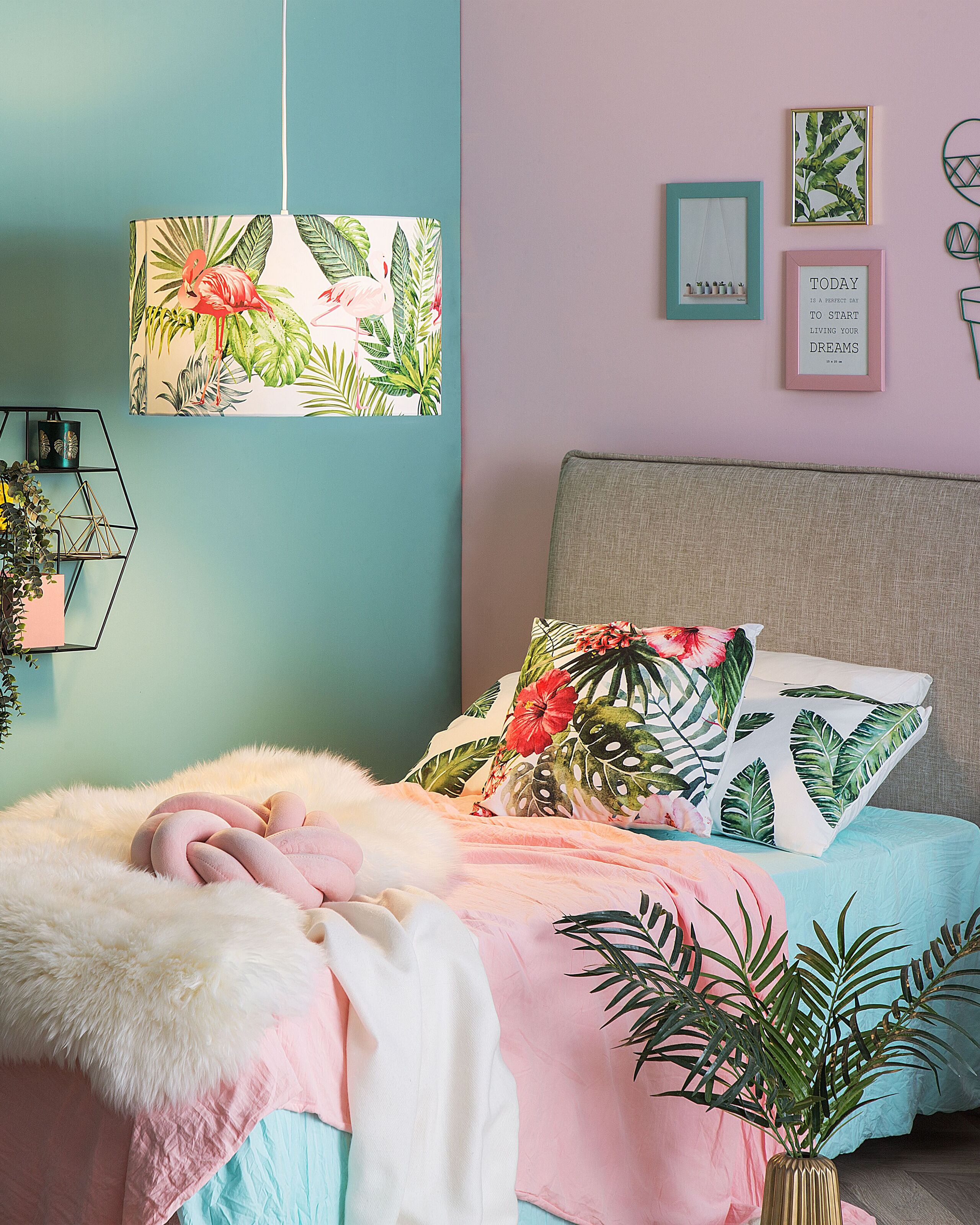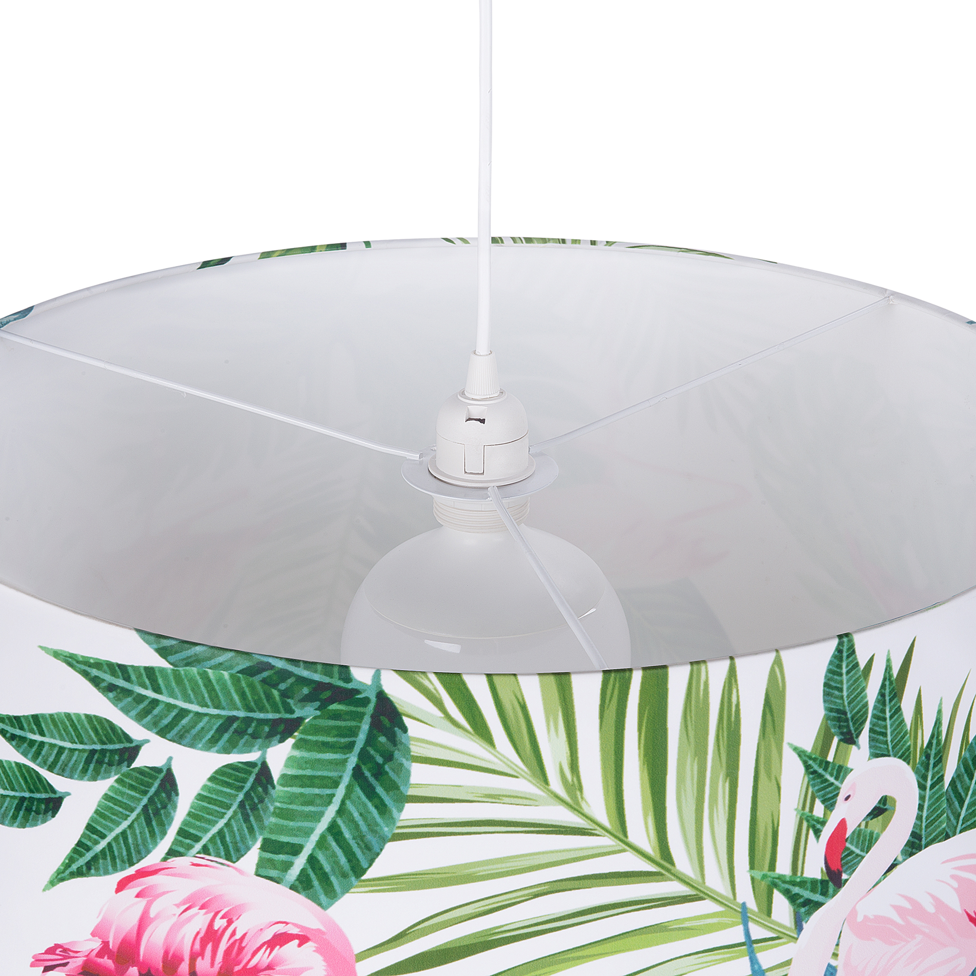Kuviollinen pyöreä riippuvalaisin. Tämä trendikäs riippuvalaisin täydentää lasten ja nuorten makuuhuoneiden sisustusta ja tuo persoonallisuutta myös vanhempien tiloihin. Valkoisella pohjalla olevaa modernia viidakkokuviota korostavat vaaleanpunaiset flamingot. Sen sylinterin muotoinen varjostin on valmistettu polyesterikankaasta, joka luo huoneeseen rauhallisen ja miellyttävän hajavalon. Se on täydellinen lisä etenkin boho-tyylisiin tai nykyaikaisiin sisustuksiin.