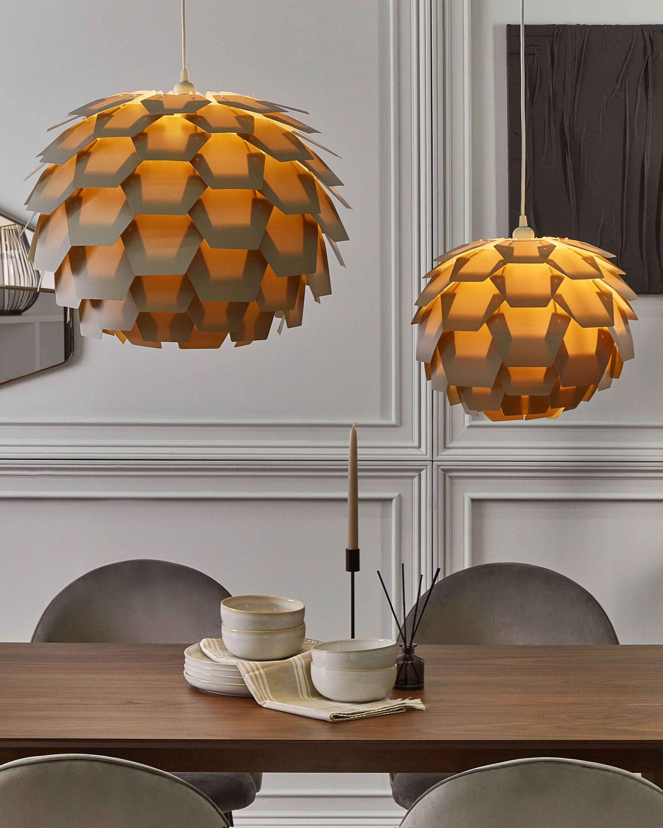 Skandinaavinen minimalistinen valaisin. Tämän riippuvalaisimen minimalistinen mutta ainutlaatuinen ja erottuva muotoilu on saanut inspiraatiota skandinaavisista sisustuksista. Useista kuusikulmion muotoisista muovilaatoista koostuva varjostin luo herkän ja tunnelmallisen valaistuksen, joka korostaa pehmeästi mitä tahansa sisustusta eri kulmista. Trendikäs väri ja käpyä muistuttava muoto saavat valaisimen erottumaan edukseen jokaisessa modernissa tai nykyaikaisessa kodin sisustuksessa.