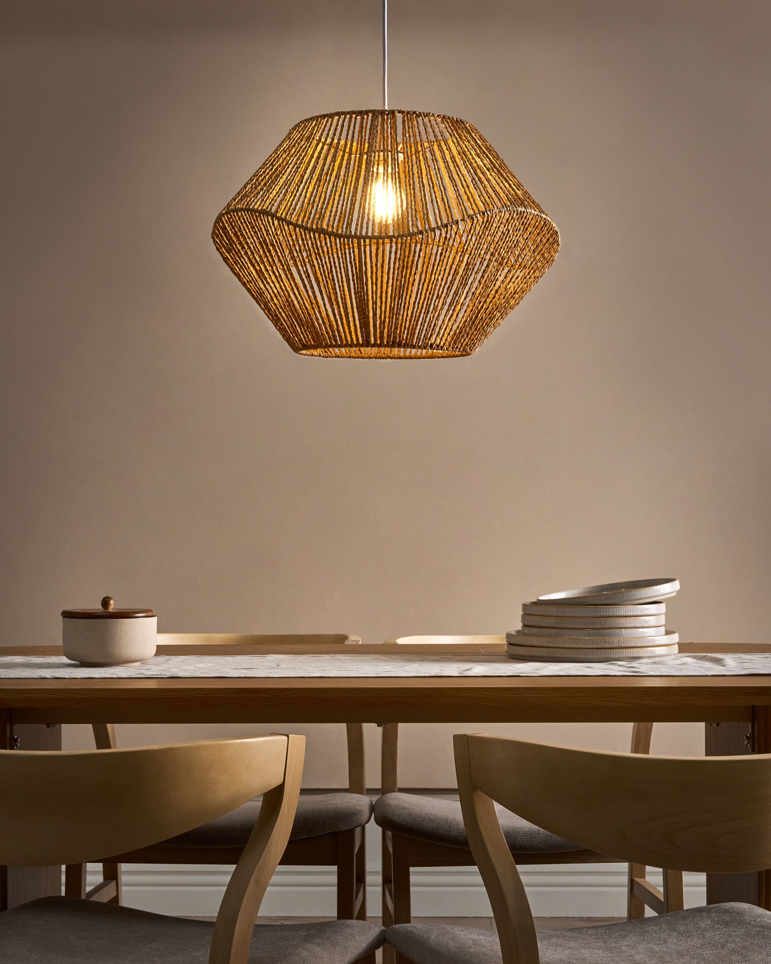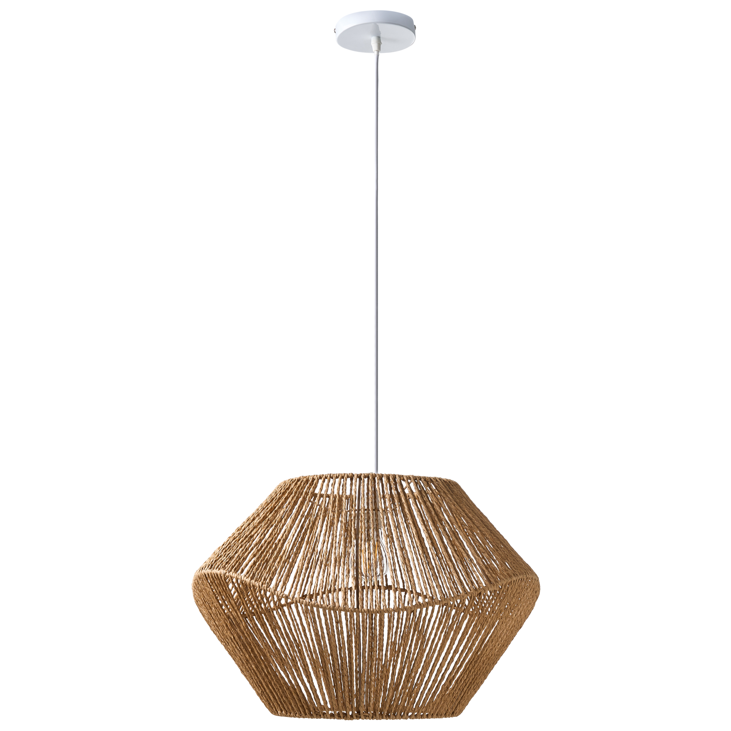 Boheemi käsintehty kattovalaisin. Tuo kotiin lämmin, luonnollinen tunnelma tällä upealla käsintehdyllä riippuvalaisimella. Sen punottu varjostin on valmistettu kestävästä paperinarusta, ja sen ainutlaatuinen avoin muotoilu heijastaa kiehtovia varjoja seinille luoden kodikkaan tunnelman. Halusitpa luoda rennon boho-tyylisen tunnelman tai vain lisätä viehätysvoimaa olohuoneeseesi, tämä valaisin on silmiinpistävä kappale, joka kohottaa sisustusta hetkessä.
