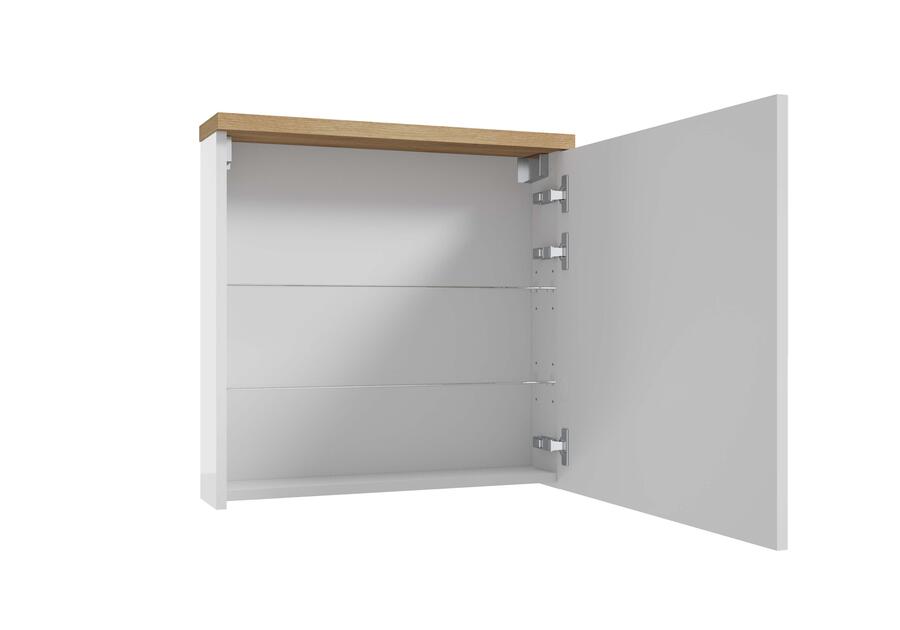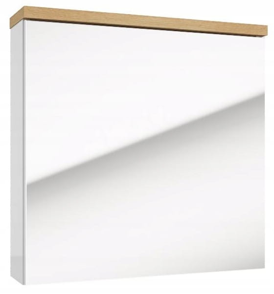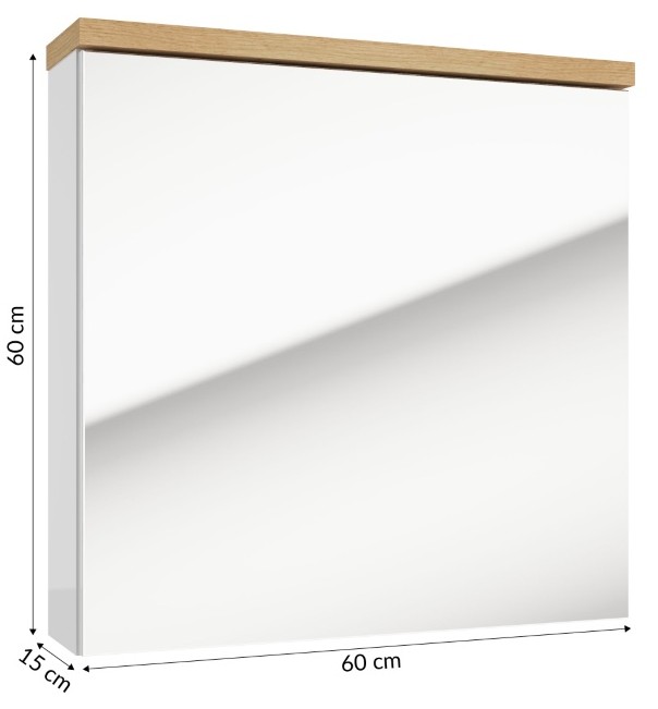 Peilikaappi 60 cmvalmistettu valkoisesta laminoidusta levystä ja peilietuosa. Kylpyhuoneen kaapin peilin yläpuolella on askartelutammea, joka lisää modernia muotoilua.