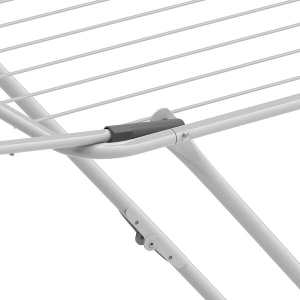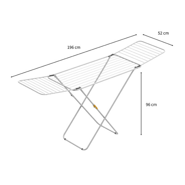 Vakaa kuivausteline, jossa on patentoitu siipien lukitusrakenne helppoa käsittelyä ja kuljettamista varten. Turvallinen jalkojen lukitusmekanismi varmistaa vakauden käytön aikana. Kokonaiskuivausnarun pituus: 20 m.