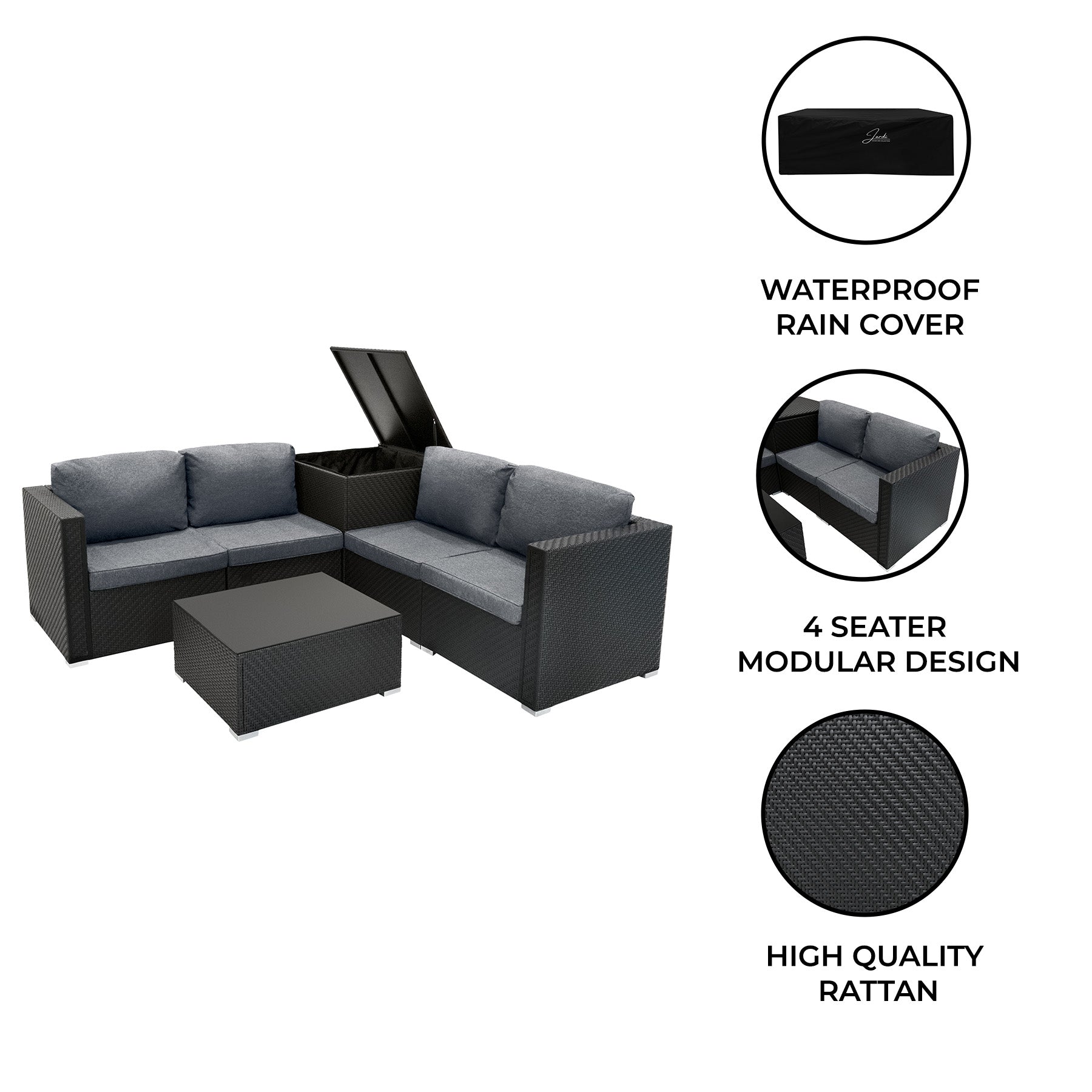 Tyylikäs neliönmuotoinen säilytyslaatikko lisää kätevyyttä entisestään ja tarjoaa reilun 250 litran tilavuuden – täydellinen tyynyjen, vilttien tai puutarhatarvikkeiden säilyttämiseen. Säilytyslaatikko yhdistää muodon ja toimivuuden saumattomasti yhdellä hydraulisella jousituksella, joka helpottaa avaamista ja turvallista sulkemista. Jotta huonekalusi pysyisivät suojattuina ympäri vuoden, olemme sisällyttäneet pakkaukseen vedenpitävän Oxford-sadesuojan, joka suojaa koko settiä säältä. Säilytyslaatikko itsessään on myös varustettu vedenpitävällä vuorauksella ja vetoketjulla, jotka varmistavat, että sisältö pysyy kuivana ja turvallisena myös märällä säällä.