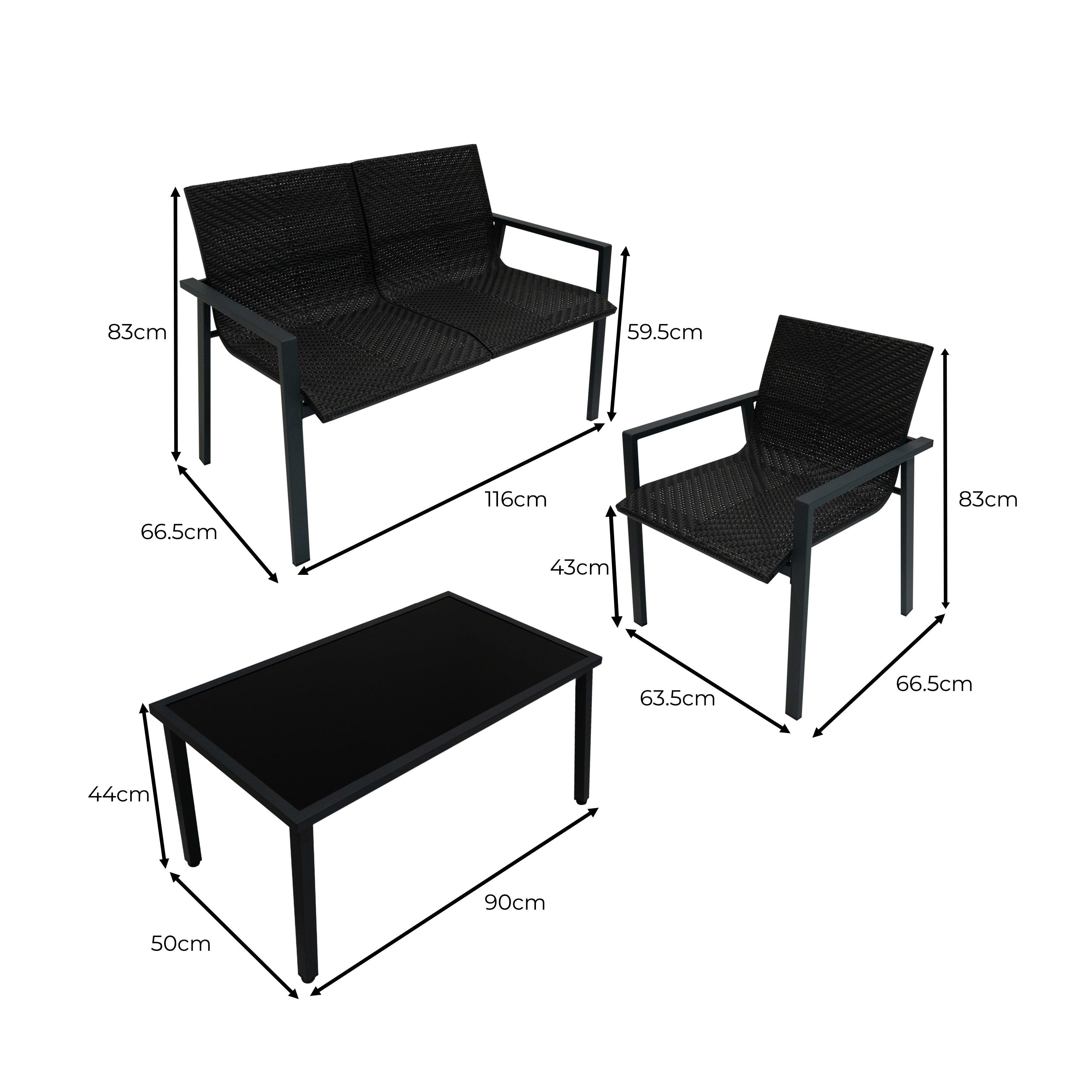 <p ="MsoNormal">Tämä setti sisältää kaksi mukavaa tuolia, yhteensopivan kahdenistuttavan sohvan ja tyylikkään lasikantisen sohvapöydän, joten se on täydellinen lisä mihin tahansa puutarhaan, terassille tai parvekkeelle. Elegantti musta koneella kudottu polyrotting tarjoaa modernin mutta ajattoman ilmeen, joka sulautuu saumattomasti mihin tahansa ulkosisustukseen ja tarjoaa samalla tukevan ja säänkestävän rakenteen. Nautitpa sitten aamukahvista tai viihdytät vieraita, tämä setti takaa sekä mukavuuden että toimivuuden.</p>