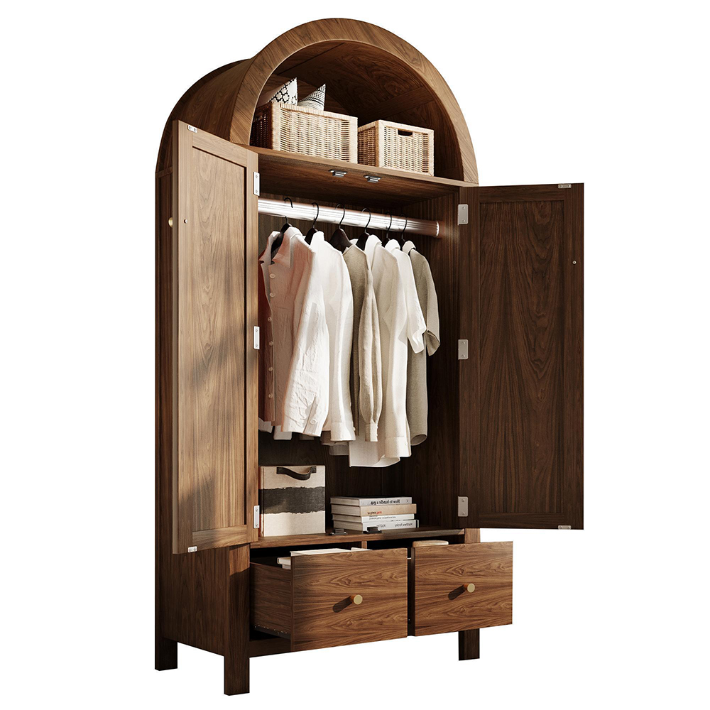 Tämän vaatekaapin yläosa koostuu puoliympyrän muotoisesta säilytystilasta ja tilavasta vaatteiden säilytysalueesta. Alumiininen vaatetanko mahdollistaa vaatteiden tai laukkujen ripustamisen tarpeen mukaan. Alaosassa on kaksi laatikkoa, jotka tarjoavat järjestettyä säilytystilaa alusvaatteille, vöille, hatuille ja muille pienille esineille.