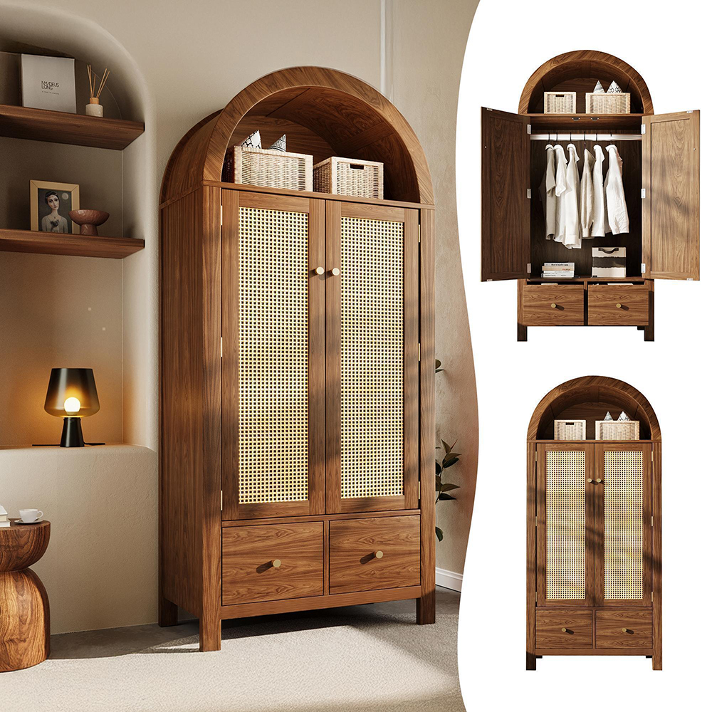 Tämä vaatekaappi on valmistettu korkealaatuisista levyistä, joissa on lämmin pähkinäviilu. Ovia koristavat keltainen rottinkipunos, klassinen kaariholvi ja hiekanväriset kartiomaiset kahvat, jotka antavat vaatekaapille lämpimän ja romanttisen maalaistyylin. Se yhdistää täydellisesti koristeellisuuden ja säilytystilan ja sopii mihin tahansa sisustukseen.