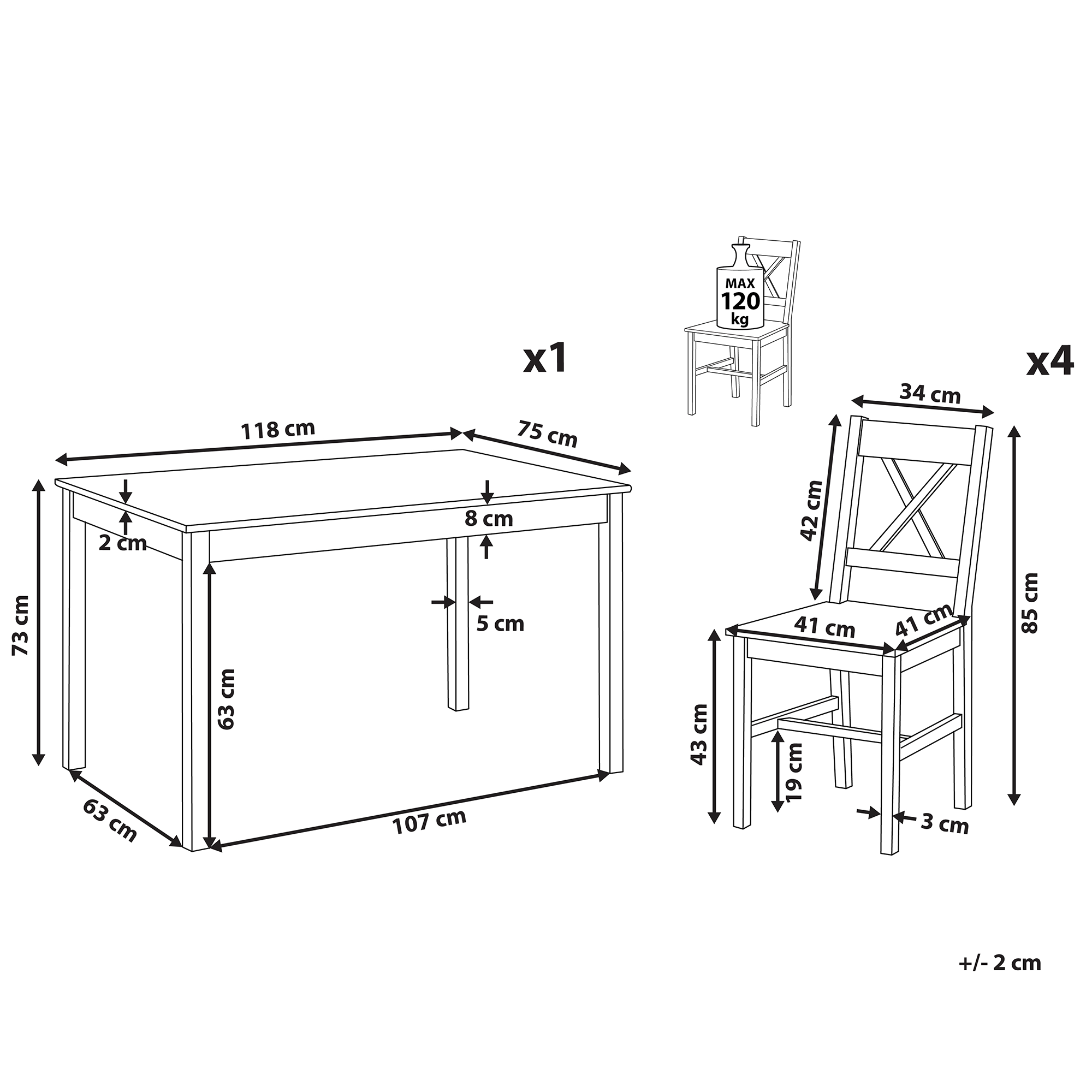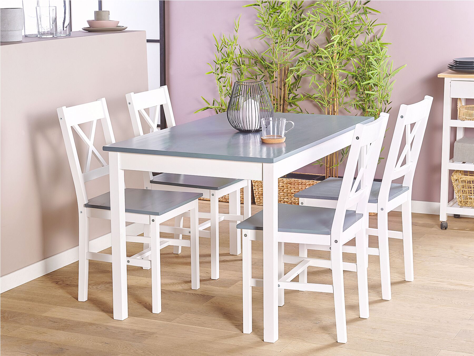 Kaunis ruokailuryhmä 4 hengelle. Tämä suoraviivainen ja yksinkertainen 4-istuttava ruokailuryhmä tuo maalaistunnelmaa mihin tahansa ruokailutilaan tai keittiöön. Kestävästä männystä valmistetut pöytä ja tuolit ovat vakaita ja helppoja ylläpitää. Ruokailuryhmän valkoisen ja harmaan värien yhdistelmä auttaa luomaan kotiisi kotoisan ja tyylikkään tunnelman. Kokonsa ansiosta se sopii pienempäänkin tilaan.