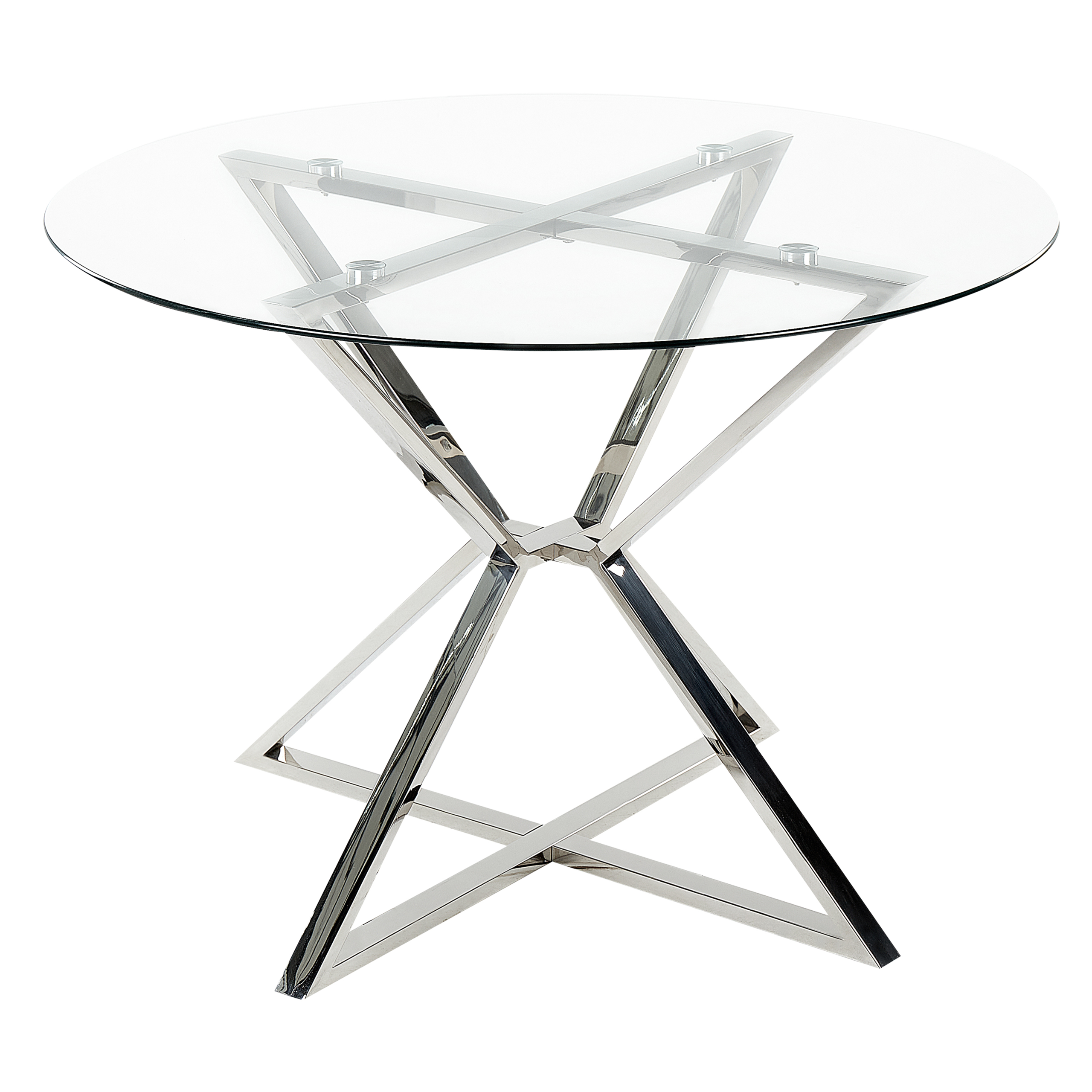 Moderni pyöreä pöytä neljälle. Uudista ruokailutilasi ilmettä ja tuo siihen glamour-tunnelmaa tällä pyöreällä ruokapöydällä. Hopean värinen ruostumattomasta teräksestä valmistettu runko korostaa kirkasta karkaistu lasitasoa kauniisti. Materiaaliensa ansiosta pöytä on erittäin kestävä ja helppo puhdistaa. Leveä pöytälevy tarjoaa tarpeeksi tilaa jopa neljälle hengelle sekä useille erilaisille tarjottaville ja juomille. Väriyhdistelmänsä ansiosta pöytä sulautuu täydellisesti moderneihin sisustuksiin.