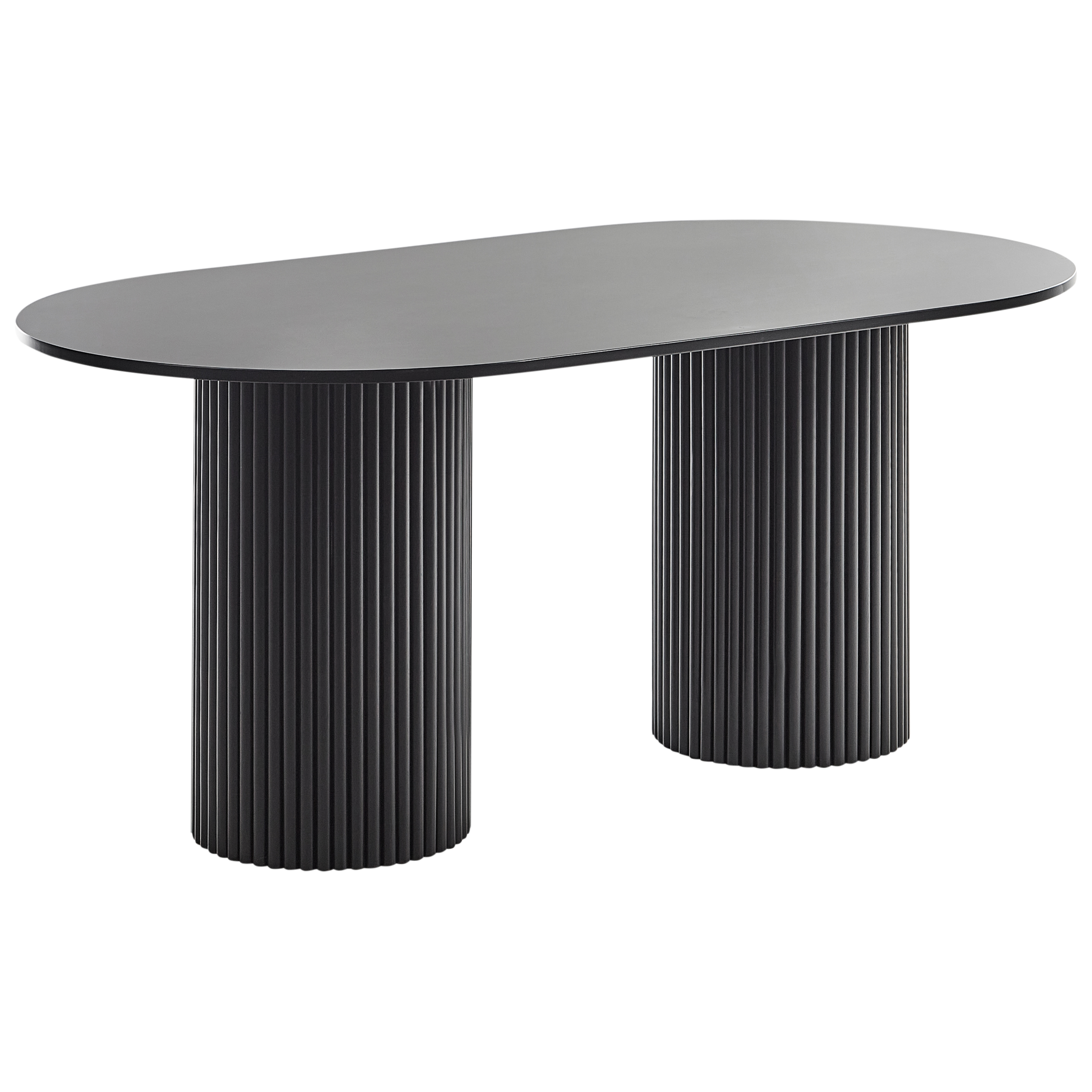 Rustiikkinen ovaali pöytä kuudelle hengelle. Kohota ruokailutilaasi tällä rustiikkisella ruokapöydällä. Ovaali pöytälevy on valmistettu MDF-levystä ja viimeistelty tyylikkäällä mustalla värillä, jota täydentävät kaksi kumipuusta valmistettua uurrettua pylväsjalkaa. Muotoilu ja värimaailma tekevät pöydästä kauniin keskipisteen moniin sisustustyyleihin. Tilava taso tarjoaa ihanteellisen paikan perheen yhteisille aterioille ja ystävien kanssa vietettäviin kokoontumisiin.