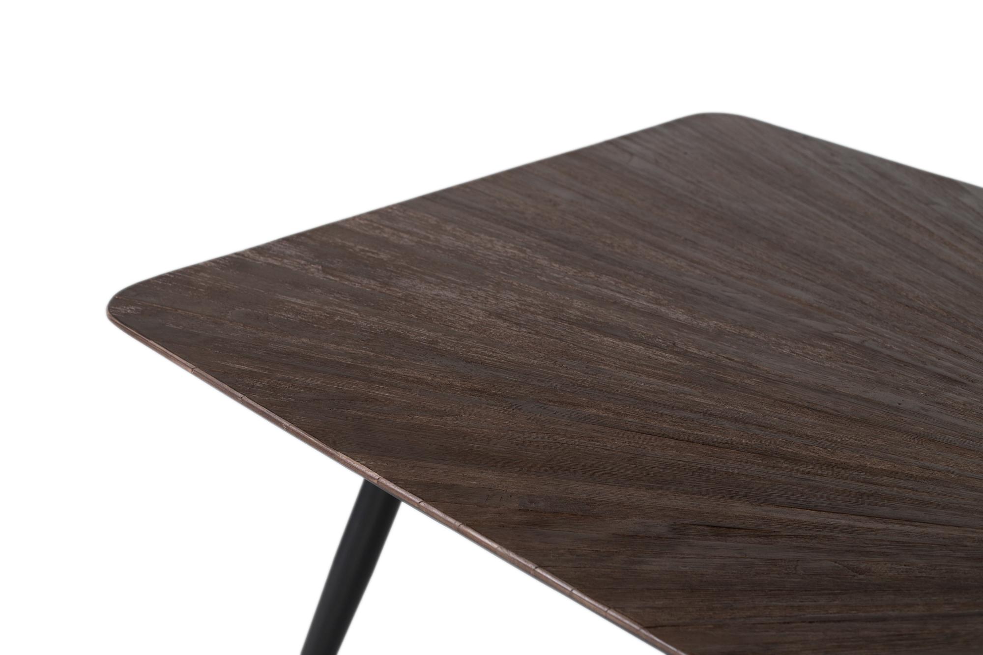 Tämä ruokapöytä yhdistää eleganssin, toimivuuden ja kestävän kehityksen huolellisen kierrätetystä tiikkipuusta valmistetun työn ja mustaksi maalattujen rautajalkojen ansiosta. Suorakulmaisen pöytälevyn käsityönä syntyy silmiinpistävä säteittäinen kuvio, joka alkaa keskeltä ja korostaa tiikille ominaisia luonnollisia syy- ja sävyvaihteluita. Pöytälevyn pyöristetyt kulmat antavat visuaalista keveyttä ja turvallisuutta, kun taas hoikat, hieman kulmassa olevat metallijalat tarjoavat tukevan ja vakaan pohjan. JALKOJEN KORKEUS: 74 CM PÖYTÄTASON PAKSUUS: 3 CM JALKOJEN VÄLINEN ETÄISYYS: 165 CM