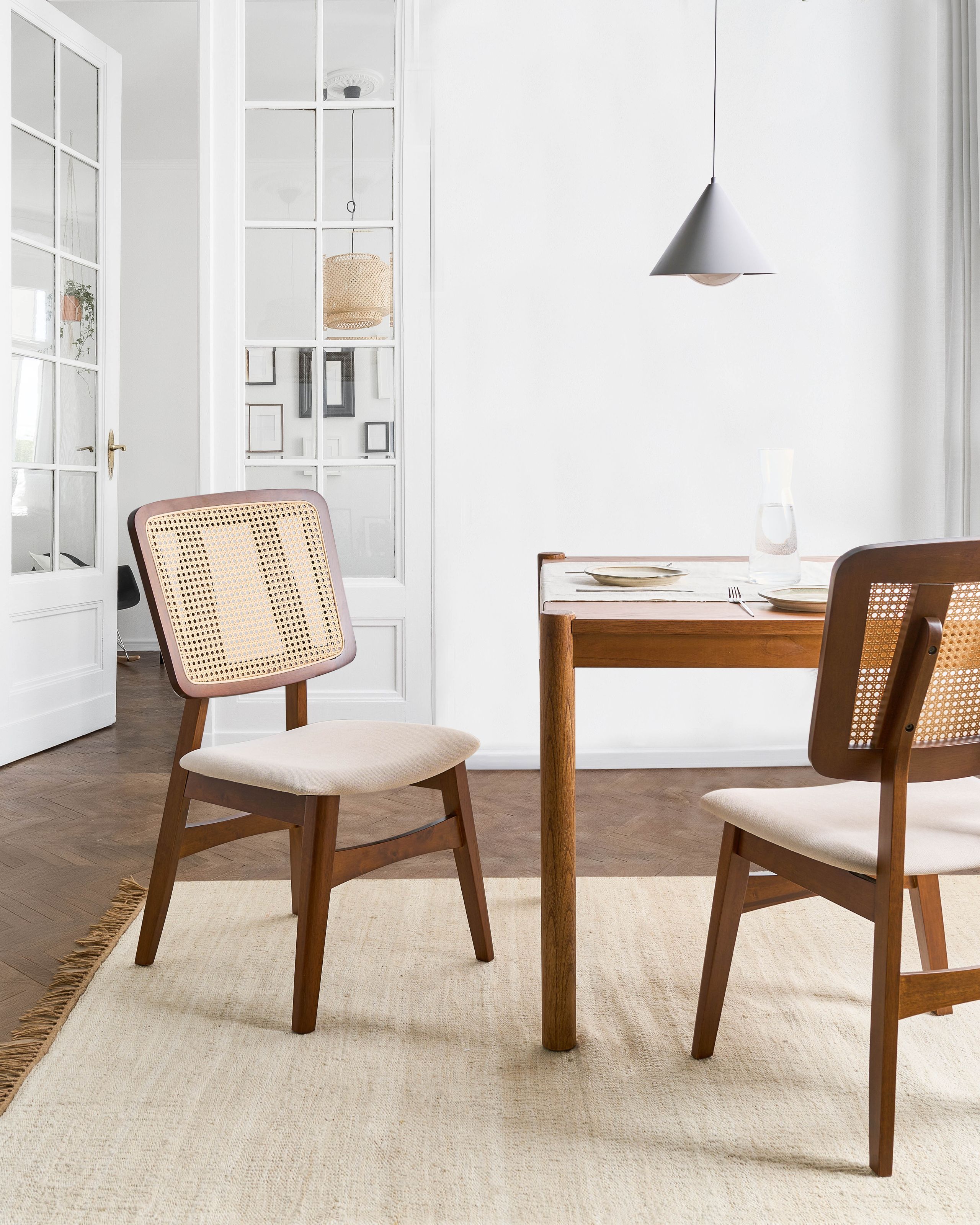 Retrotyylinen tuolisetti wieniläispunotuilla selkänojilla. Tämä kahden retrotyylisen ruokatuolin setti tuo kotiin ajatonta eleganssia. Tukevasta lakatusta kumipuusta valmistetut tuolit yhdistävät tyylin ja kestävyyden. Vaaleanbeigellä polyesterikankaalla verhoillut istuimet takaavat mukavuuden, kun taas selkänojien wieniläistyyliset polyrottinkipunokset lisäävät ripauksen viehätystä ja luonnetta. Tuolit sopivat täydellisesti vintage-tyylisiin ruokailutiloihin ja kodikkaisiin keittiöihin.