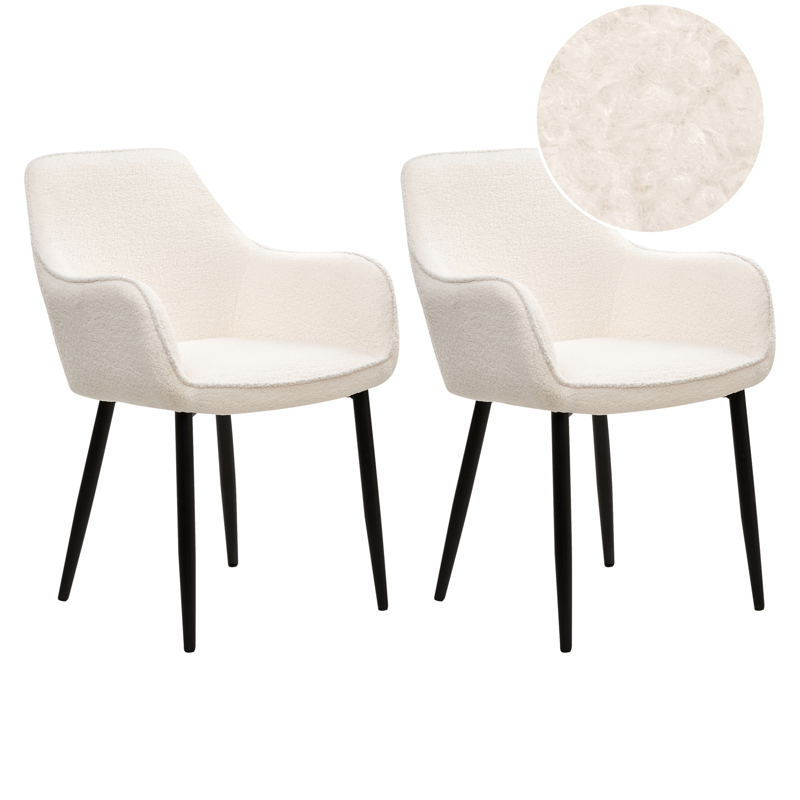 Moderni verhoiltu tuolisetti käsinojilla. Tämän kahden ruokatuolin setin avulla jokainen ateria kuluu mukavuuden ja tyylin ympäröimänä. Valkoisella bukleekankaalla verhoillut tuolit ovat erittäin miellyttävän tuntuisia ja pehmeitä, mutta samalla kestäviä ja vähän ylläpitoa vaativia. Tyylikkäät mustat rautajalat täydentävät verhoilua ja takaavat erinomaisen vakauden. Klassisen muotoilu tekee niistä loistavan lisän erilaisiin sisustuksiin, retrosta moderniin.