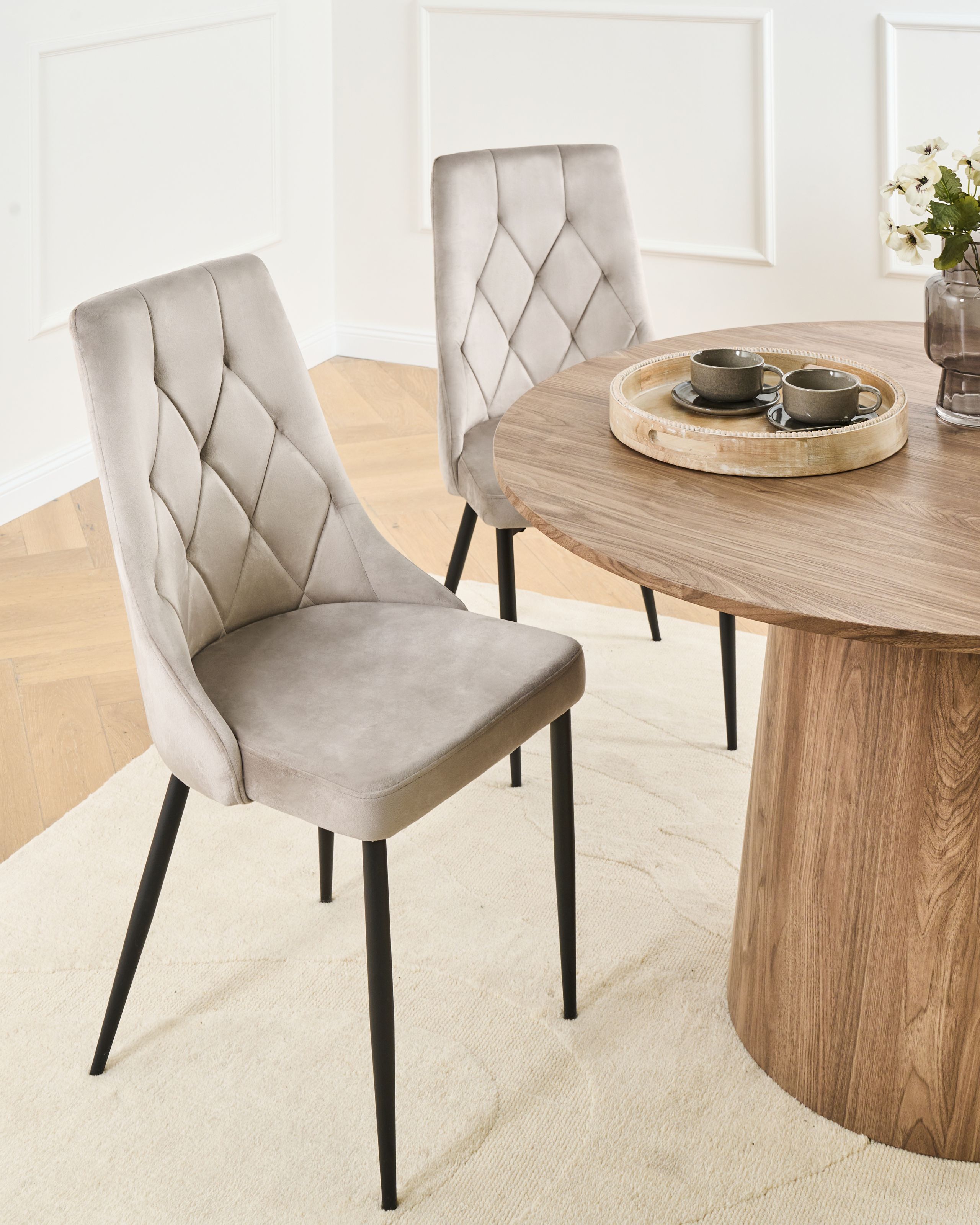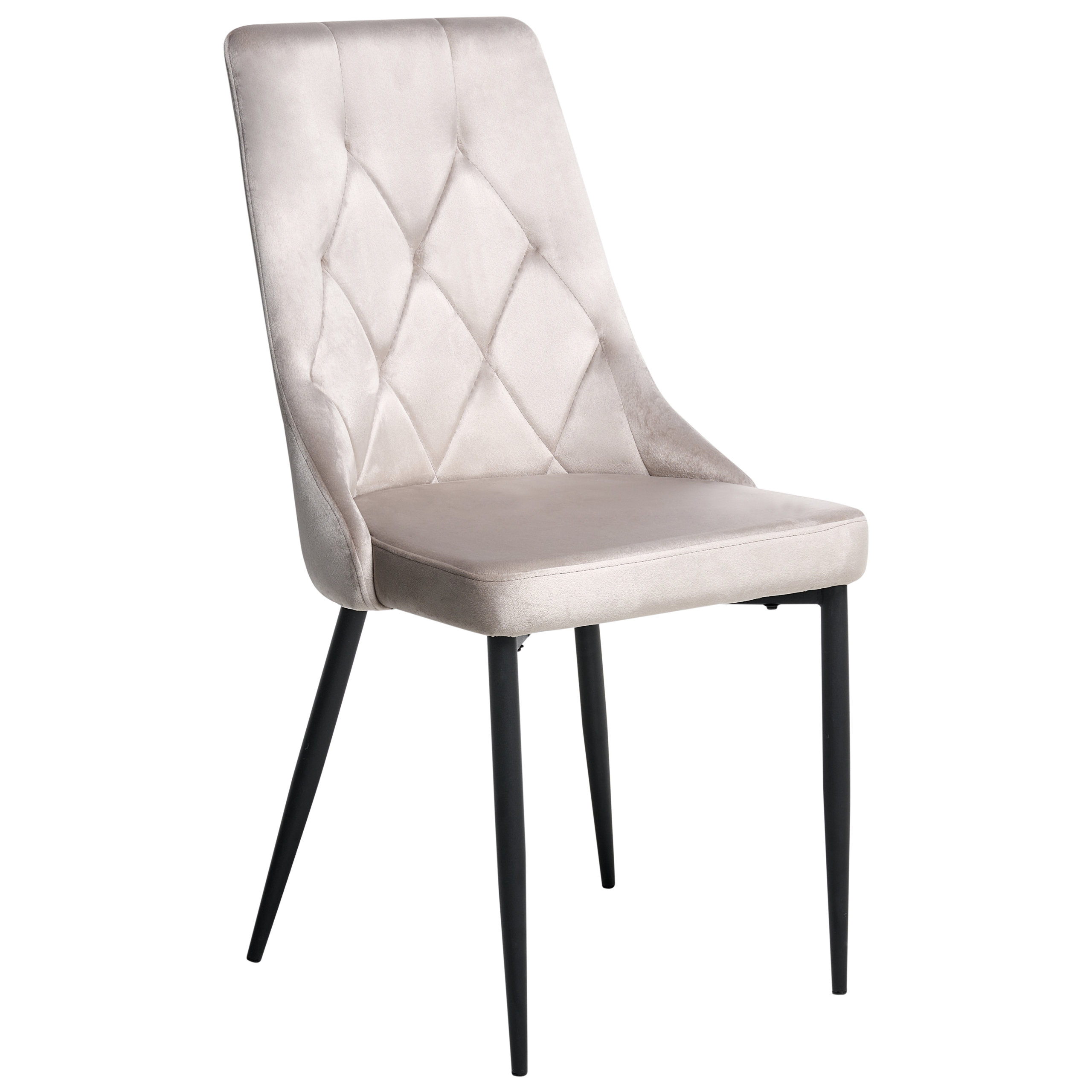 Glamour-tyyliset keittiön tuolit. Lisää tilaan hienostunutta charmia näillä käsinojattomilla ruokatuoleilla. Pehmeällä, korkealaatuisella sametilla verhoillut ja elegantisti tuftatut tuolit tarjoavat sekä mukavuutta että tyyliä. Tukevat rautajalat takaavat kestävän tuen, ja tyylikäs muotoilu sulautuu saumattomasti erilaisiin sisustustyyleihin. Tuolit sopivat erinomaisesti ruokailutiloihin tai olohuoneisiin, jotka kaipaavat tyylikästä ja monipuolista istuinpäivitystä.