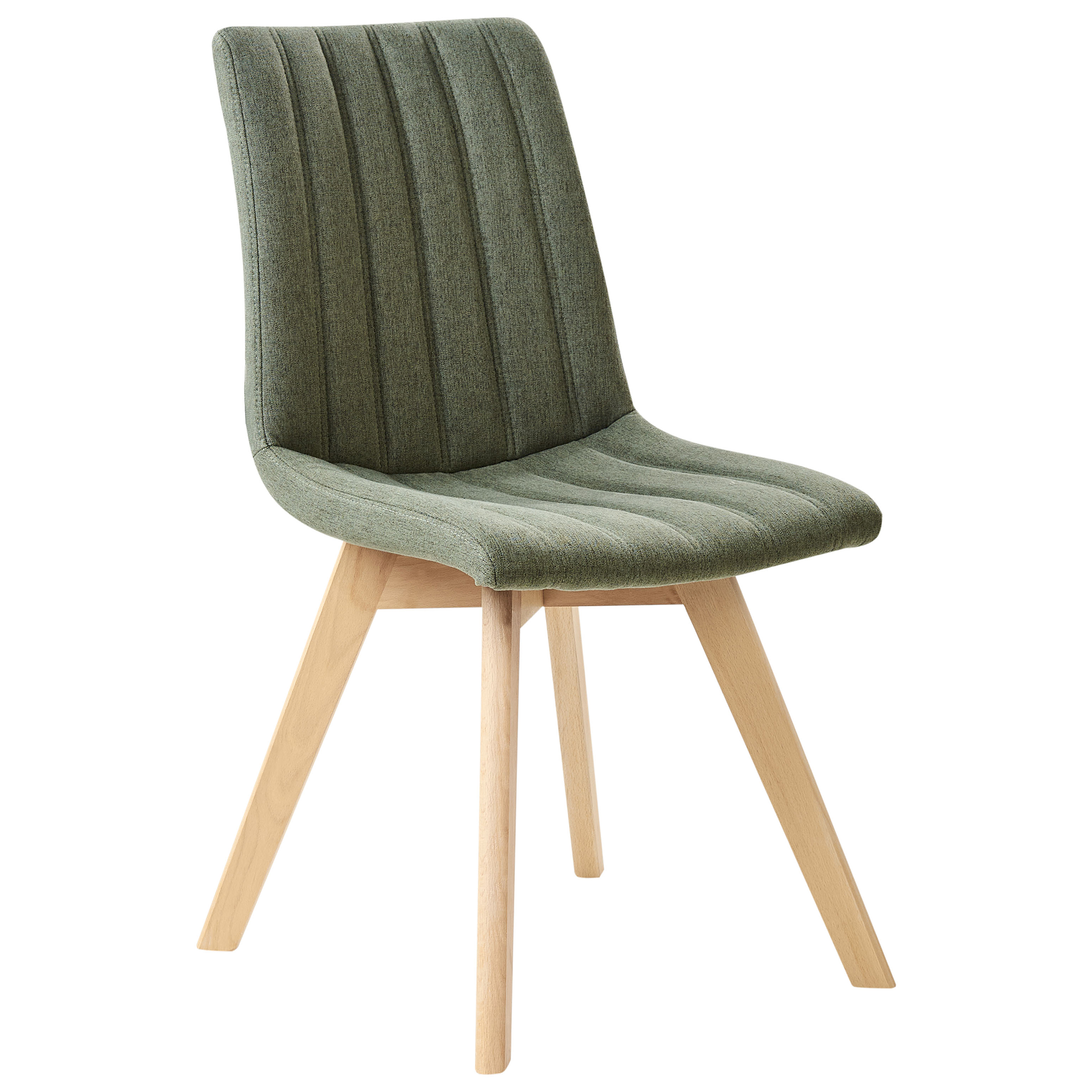 Retro kangastuolisetti pystytikkauksella. Tuo ruokailutilaasi ripaus retroviehätystä tällä kahden tyylikkään tuolin setillä. Tuolien istuinosien vankka teräsrakenne varmistaa pitkäikäisen käytön, kun taas muhkea pehmustus takaa erinomaisen istumamukavuuden. Helppohoitoinen tummanvihreä polyesteriverhoilu sopii kauniisti yhteen vaaleansävyisten massiivipyökkijalkojen kanssa, luoden hienostuneen ilmeen. Istuimissa ja selkänojissa on klassinen pystysuora tikkaus, joka kohottaa ruokatuolien ajatonta ilmettä. Yhdistä tuolit yhteensopivan pöydän kanssa luodaksesi kutsuvan paikan perheen kokoontumisille ja illalliskutsuille.
