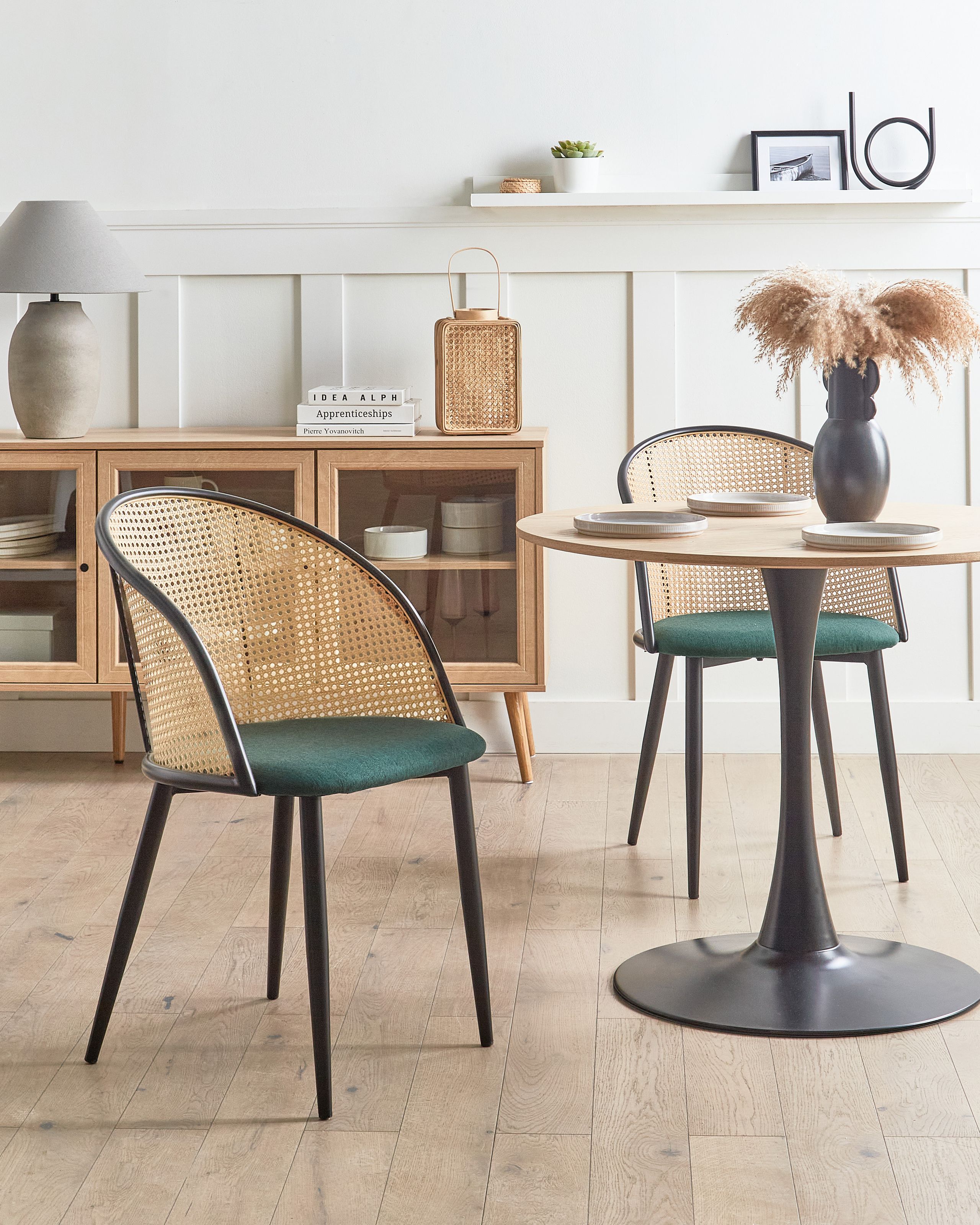 Retrotyylinen tuolisetti rottinkipunoksisilla selkänojilla. Koe ajattoman muotoilun taika ruokailutilassasi tällä kahden ruokatuolin setillä. Raudasta valmistetut rungot antavat tuoleille industriaalista ilmettä, kun taas värimaailma lisää retrohenkeä. Pellavaverhoillut istuimet tarjoavat mukavuutta, ja leveät, koristeellisella rottinkipunoksella viimeistellyt selkänojat tuovat ripauksen vintage-ilmettä. Jaloissa olevat muovisuojat suojaavat lattiaa naarmuilta. Kohenna ympäristöäsi tällä täydellisellä tyylin ja kestävän viehätyksen yhdistelmällä.