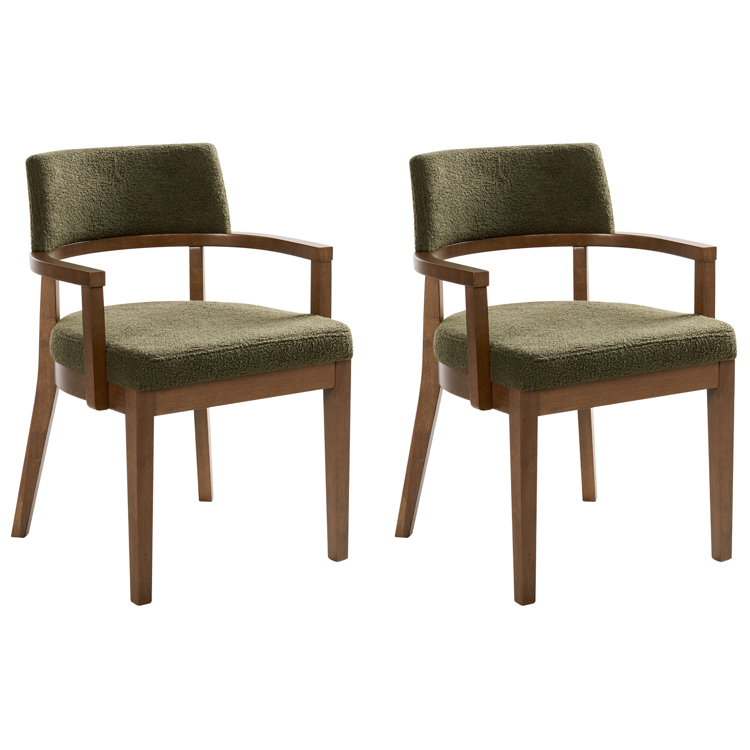 Perinteinen ruokapöydän tuolisetti käsinojilla. Lisää ripaus hienostuneisuutta kotiisi tällä perinteisellä kahden ruokatuolin setillä. Tuolien rungot on valmistettu tukevasta tumman sävyisestä kumipuusta, jota täydentävät vihreällä bukleekankaalla verhoillut istuimet ja selkänojat. Ne tarjoavat täydellisen yhdistelmän mukavuutta ja tyyliä, käytettiinpä niitä sitten juhlien istumapaikkoina tai vain rentoutumispaikkoina. Ne ovat hurmaava tapa tuoda häivähdyksen lämpöä mihin tahansa tilaan ja sisustukseen.