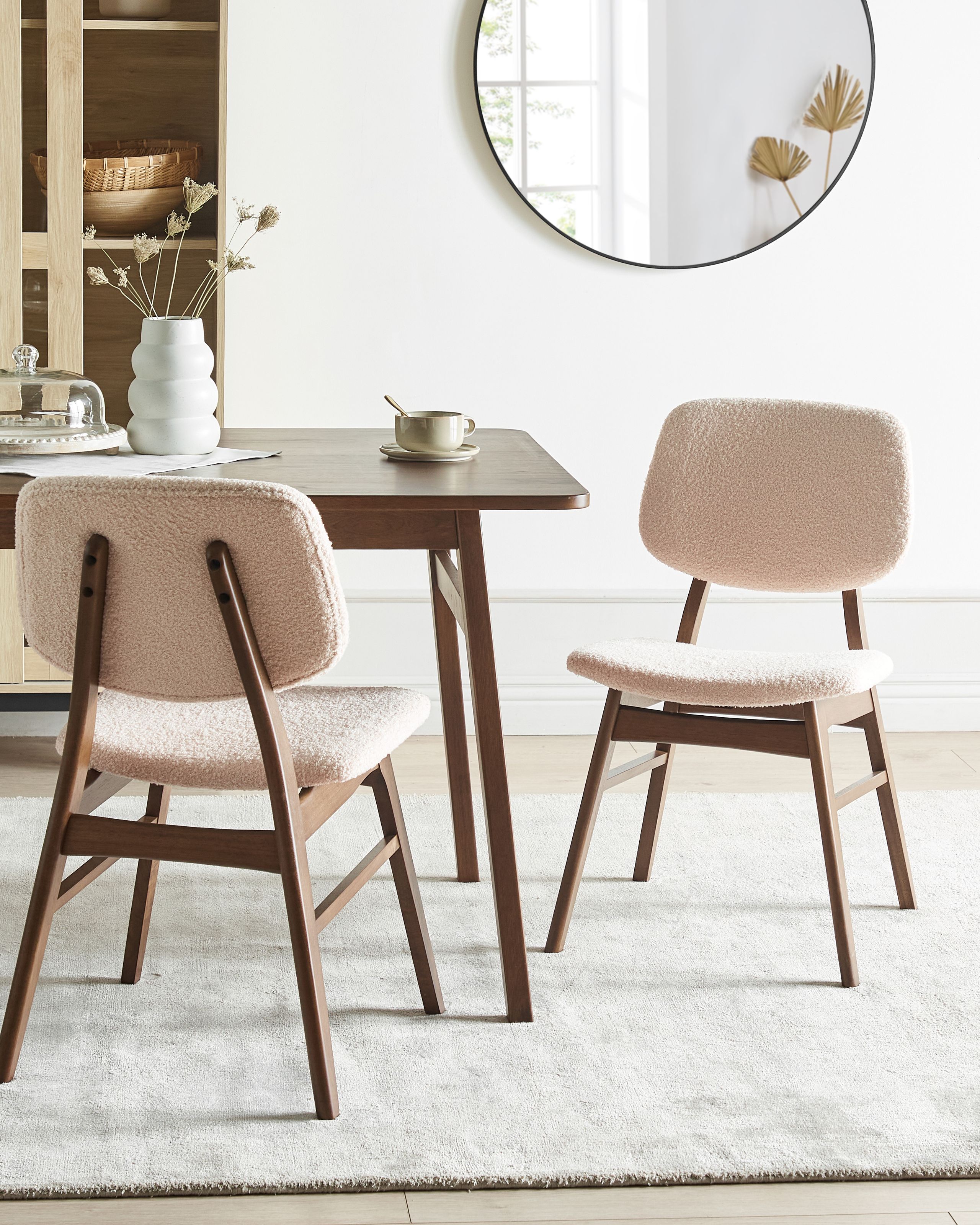 Retrotyylinen kahden ruokatuolin setti. Kohota ruokailutilaa tai keittiötä tällä hurmaavalla kahden retrotyylin inspiroiman ruokatuolin setillä. Luonnollisesta kumipuusta valmistetut vankat rungot erottuvat edukseen kauniiden, rustiikkista viehätystä tuovien näkyvien puunsyiden ja -solmujen ansiosta. Pehmeällä bukleekankaalla verhoillut istuimet ja selkänojat lisäävät tekstuuria ja ajatonta eleganssia, yhdistäen mukavuuden täydellisesti vintage-estetiikkaan. Tuolit sopivat erinomaisesti ruokailuun tai korostusistuimiksi, tuoden luonnetta ja lämpöä jokaiseen tilaan.