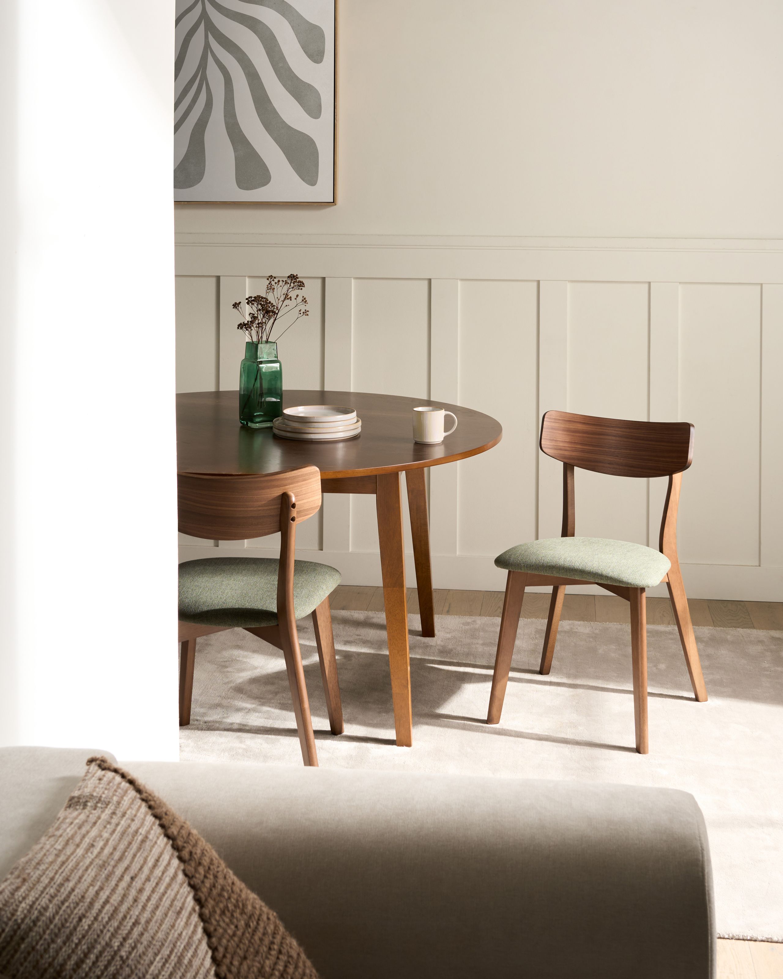 Retrotyylinen tuolisetti. Lisää kotiin ajatonta viehätystä tällä kahden retrotyylisen ruokatuolin setillä. Vankat, luonnollisesta kumipuusta valmistetut rungot tarjoavat kestävää tukea, ja puun näkyvät syyt ja solmut lisäävät ripauksen rustiikkista eleganssia. Istuimet on verhoiltu kestävällä polyesterikankaalla, joka tarjoaa mukavuutta ja tyyliä sekä sointuu täydellisesti vintage-tyylin inspiroimaan muotoiluun. Tuolit sopivat erinomaisesti ruokailuun tai korostustuoleiksi, yhdistäen saumattomasti esteettisen ulkonäön ja toiminnallisuuden.